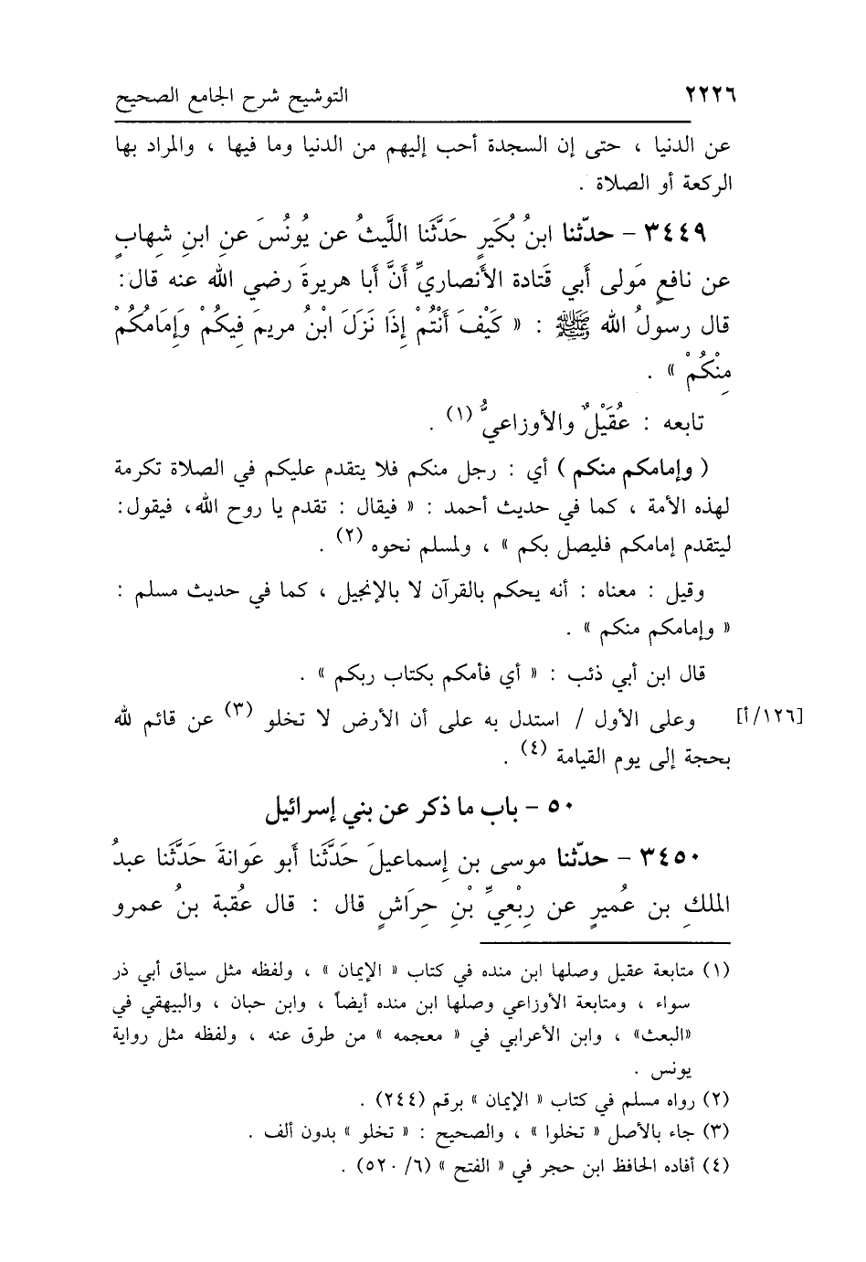 3449 - حَدَّثَنَا ابْنُ بُكَيْرٍ، حَدَّثَنَا اللَّيْثُ، عَنْ يُونُسَ، عَنِ ابْنِ شِهَابٍ، عَنْ نَافِعٍ، مَوْلَى أَبِي قَتَادَةَ الأَنْصَارِيِّ، أَنَّ أَبَا هُرَيْرَةَ، قَالَ: قَالَ رَسُولُ اللَّهِ صَلَّى اللهُ عَلَيْهِ وَسَلَّمَ: «كَيْفَ أَنْتُمْ إِذَا نَزَلَ ابْنُ مَرْيَمَ فِيكُمْ، وَإِمَامُكُمْ مِنْكُمْ»، تَابَعَهُ عُقَيْلٌ، وَالأَوْزَاعِيُّ.