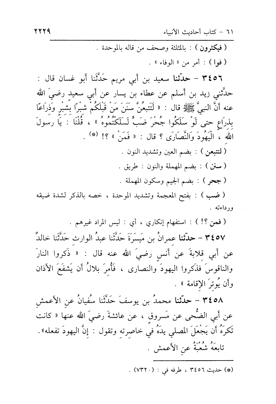 3456 - حَدَّثَنَا سَعِيدُ بْنُ أَبِي مَرْيَمَ، حَدَّثَنَا أَبُو غَسَّانَ، قَالَ: حَدَّثَنِي زَيْدُ بْنُ أَسْلَمَ، عَنْ عَطَاءِ بْنِ يَسَارٍ، عَنْ أَبِي سَعِيدٍ رَضِيَ اللَّهُ عَنْهُ، أَنَّ النَّبِيَّ صَلَّى اللهُ عَلَيْهِ وَسَلَّمَ، قَالَ: «لَتَتَّبِعُنَّ سَنَنَ مَنْ قَبْلَكُمْ شِبْرًا بِشِبْرٍ، وَذِرَاعًا بِذِرَاعٍ، حَتَّى لَوْ سَلَكُوا جُحْرَ ضَبٍّ لَسَلَكْتُمُوهُ»، قُلْنَا يَا رَسُولَ اللَّهِ: اليَهُودَ، وَالنَّصَارَى قَالَ: «فَمَنْ».