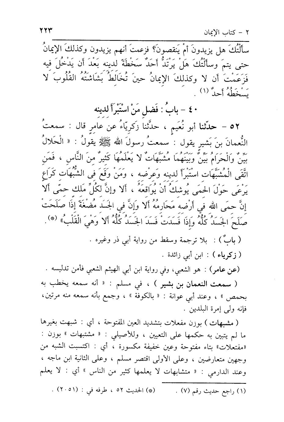 52 - حَدَّثَنَا أَبُو نُعَيْمٍ، حَدَّثَنَا زَكَرِيَّاءُ، عَنْ عَامِرٍ، قَالَ: سَمِعْتُ النُّعْمَانَ بْنَ بَشِيرٍ، يَقُولُ: سَمِعْتُ رَسُولَ اللَّهِ صَلَّى اللهُ عَلَيْهِ وَسَلَّمَ يَقُولُ: " الحَلاَلُ بَيِّنٌ، وَالحَرَامُ بَيِّنٌ، وَبَيْنَهُمَا مُشَبَّهَاتٌ لاَ يَعْلَمُهَا كَثِيرٌ مِنَ النَّاسِ، فَمَنِ اتَّقَى المُشَبَّهَاتِ اسْتَبْرَأَ لِدِينِهِ وَعِرْضِهِ، وَمَنْ وَقَعَ فِي الشُّبُهَاتِ: كَرَاعٍ يَرْعَى حَوْلَ الحِمَى، يُوشِكُ أَنْ يُوَاقِعَهُ، أَلاَ وَإِنَّ لِكُلِّ مَلِكٍ حِمًى، أَلاَ إِنَّ حِمَى اللَّهِ فِي أَرْضِهِ مَحَارِمُهُ، أَلاَ وَإِنَّ فِي الجَسَدِ مُضْغَةً: إِذَا صَلَحَتْ صَلَحَ الجَسَدُ كُلُّهُ، وَإِذَا فَسَدَتْ فَسَدَ الجَسَدُ كُلُّهُ، أَلاَ وَهِيَ القَلْبُ".