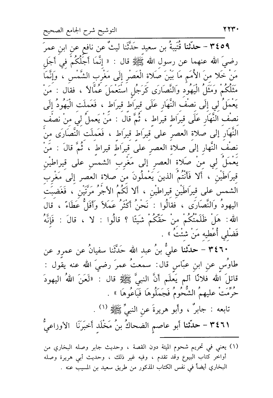 3459 - حَدَّثَنَا قُتَيْبَةُ بْنُ سَعِيدٍ، حَدَّثَنَا لَيْثٌ، عَنْ نَافِعٍ، عَنِ ابْنِ عُمَرَ رَضِيَ اللَّهُ عَنْهُمَا، عَنْ رَسُولِ اللَّهِ صَلَّى اللهُ عَلَيْهِ وَسَلَّمَ، قَالَ: " إِنَّمَا أَجَلُكُمْ فِي أَجَلِ مَنْ خَلاَ مِنَ الأُمَمِ، مَا بَيْنَ صَلاَةِ العَصْرِ إِلَى مَغْرِبِ الشَّمْسِ، وَإِنَّمَا مَثَلُكُمْ وَمَثَلُ اليَهُودِ، وَالنَّصَارَى، كَرَجُلٍ اسْتَعْمَلَ عُمَّالًا، فَقَالَ: مَنْ يَعْمَلُ لِي إِلَى نِصْفِ النَّهَارِ عَلَى قِيرَاطٍ قِيرَاطٍ، فَعَمِلَتِ اليَهُودُ إِلَى نِصْفِ النَّهَارِ عَلَى قِيرَاطٍ قِيرَاطٍ، ثُمَّ قَالَ: مَنْ يَعْمَلُ لِي مِنْ نِصْفِ النَّهَارِ إِلَى صَلاَةِ العَصْرِ عَلَى قِيرَاطٍ قِيرَاطٍ، فَعَمِلَتِ النَّصَارَى مِنْ نِصْفِ النَّهَارِ إِلَى صَلاَةِ العَصْرِ عَلَى قِيرَاطٍ قِيرَاطٍ، ثُمَّ قَالَ: مَنْ يَعْمَلُ لِي مِنْ صَلاَةِ العَصْرِ إِلَى مَغْرِبِ الشَّمْسِ عَلَى قِيرَاطَيْنِ قِيرَاطَيْنِ، أَلاَ، فَأَنْتُمُ الَّذِينَ يَعْمَلُونَ مِنْ صَلاَةِ العَصْرِ إِلَى مَغْرِبِ الشَّمْسِ، عَلَى قِيرَاطَيْنِ قِيرَاطَيْنِ، أَلاَ لَكُمُ الأَجْرُ مَرَّتَيْنِ، فَغَضِبَتِ اليَهُودُ، وَالنَّصَارَى، فَقَالُوا: نَحْنُ أَكْثَرُ عَمَلًا وَأَقَلُّ عَطَاءً، قَالَ اللَّهُ: هَلْ ظَلَمْتُكُمْ مِنْ حَقِّكُمْ شَيْئًا؟ قَالُوا: لاَ، قَالَ: فَإِنَّهُ فَضْلِي أُعْطِيهِ مَنْ شِئْتُ".