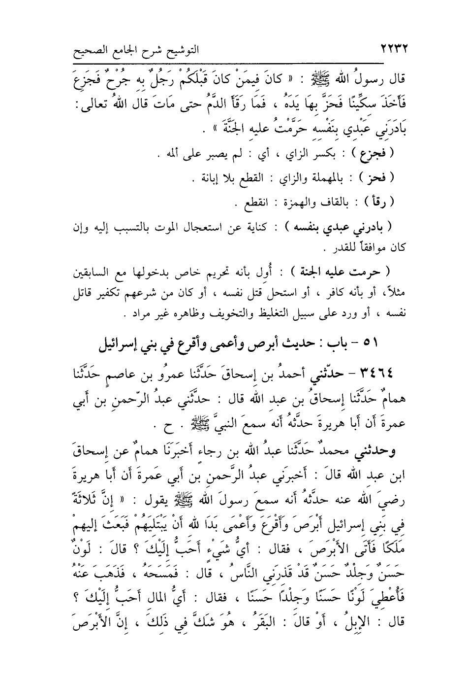 (حرمت عليه الجنة): أُوِل بأنه تحريم خاص بدخولها مع السابقين مثلًا، أو بأنه كافر، أو استحل قتل نفسه، أو كان من شرعهم تكفير قاتل نفسه، أو ورد على سبيل التغليظ والتخويف وظاهره غير مراد.