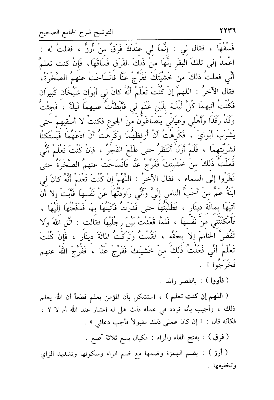 فَسُقْهَا، فَقَالَ لِي: إِنَّمَا لِي عِنْدَكَ فَرَقٌ مِنْ أَرُزٍّ، فَقُلْتُ لَهُ: اعْمِدْ إِلَى تِلْكَ البَقَرِ، فَإِنَّهَا مِنْ ذَلِكَ الفَرَقِ فَسَاقَهَا، فَإِنْ كُنْتَ تَعْلَمُ أَنِّي فَعَلْتُ ذَلِكَ مِنْ خَشْيَتِكَ فَفَرِّجْ عَنَّا، فَانْسَاحَتْ عَنْهُمُ الصَّخْرَةُ، فَقَالَ الآخَرُ: اللَّهُمَّ إِنْ كُنْتَ تَعْلَمُ أَنَّهُ كَانَ لِي أَبَوَانِ شَيْخَانِ كَبِيرَانِ، فَكُنْتُ آتِيهِمَا كُلَّ لَيْلَةٍ بِلَبَنِ غَنَمٍ لِي، فَأَبْطَأْتُ عَلَيْهِمَا لَيْلَةً، فَجِئْتُ وَقَدْ رَقَدَا وَأَهْلِي وَعِيَالِي يَتَضَاغَوْنَ مِنَ الجُوعِ، فَكُنْتُ لاَ أَسْقِيهِمْ حَتَّى يَشْرَبَ أَبَوَايَ فَكَرِهْتُ أَنْ أُوقِظَهُمَا، وَكَرِهْتُ أَنْ أَدَعَهُمَا، فَيَسْتَكِنَّا لِشَرْبَتِهِمَا، فَلَمْ أَزَلْ أَنْتَظِرُ حَتَّى طَلَعَ الفَجْرُ، فَإِنْ كُنْتَ تَعْلَمُ أَنِّي فَعَلْتُ ذَلِكَ مِنْ خَشْيَتِكَ فَفَرِّجْ عَنَّا، فَانْسَاحَتْ عَنْهُمُ الصَّخْرَةُ حَتَّى نَظَرُوا إِلَى السَّمَاءِ، فَقَالَ الآخَرُ: اللَّهُمَّ إِنْ كُنْتَ تَعْلَمُ أَنَّهُ كَانَ لِي ابْنَةُ عَمٍّ، مِنْ أَحَبِّ النَّاسِ إِلَيَّ، وَأَنِّي رَاوَدْتُهَا عَنْ نَفْسِهَا فَأَبَتْ، إِلَّا أَنْ آتِيَهَا بِمِائَةِ دِينَارٍ، فَطَلَبْتُهَا حَتَّى قَدَرْتُ، فَأَتَيْتُهَا بِهَا فَدَفَعْتُهَا إِلَيْهَا، فَأَمْكَنَتْنِي مِنْ نَفْسِهَا، فَلَمَّا قَعَدْتُ بَيْنَ رِجْلَيْهَا، فَقَالَتْ: اتَّقِ اللَّهَ وَلاَ تَفُضَّ الخَاتَمَ إِلَّا بِحَقِّهِ، فَقُمْتُ وَتَرَكْتُ المِائَةَ دِينَارٍ، فَإِنْ كُنْتَ تَعْلَمُ أَنِّي فَعَلْتُ ذَلِكَ مِنْ خَشْيَتِكَ فَفَرِّجْ عَنَّا، فَفَرَّجَ اللَّهُ عَنْهُمْ فَخَرَجُوا".