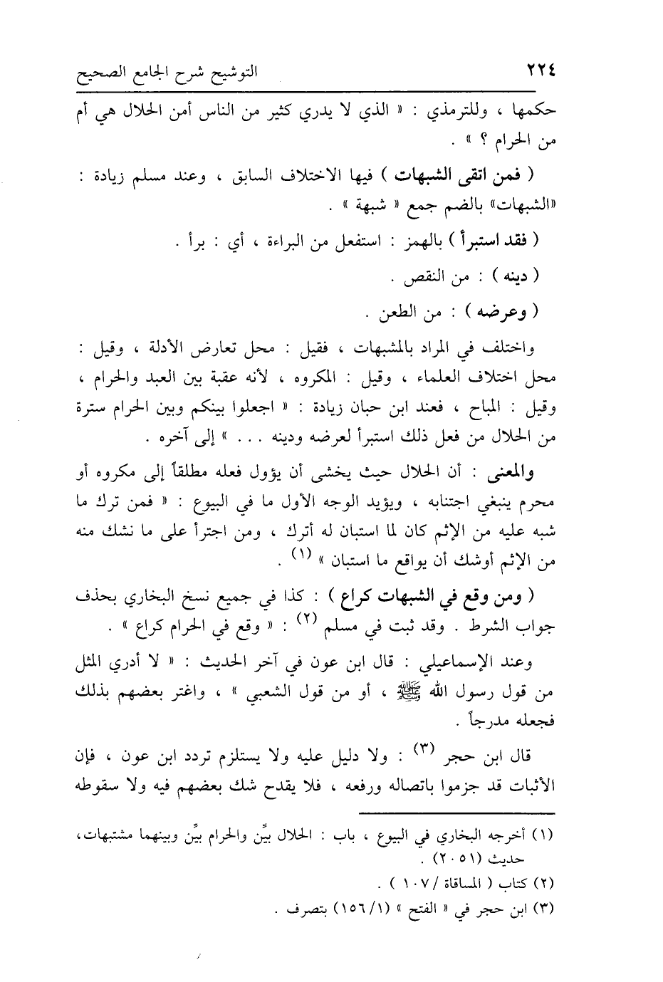 واختلف في المراد بالمشبهات، فقيل: محل تعارض الأدلة، وقيل: محل اختلاف العلماء، وقيل: المكروه، لأنه عقبة بين العبد والحرام، وقيل: المباح، فعند ابن حبان زيادة: "اجعلوا بينكم وبين الحرام سترة من الحلال من فعل ذلك استبرأ لعرضه ودينه ... " إلى آخره.