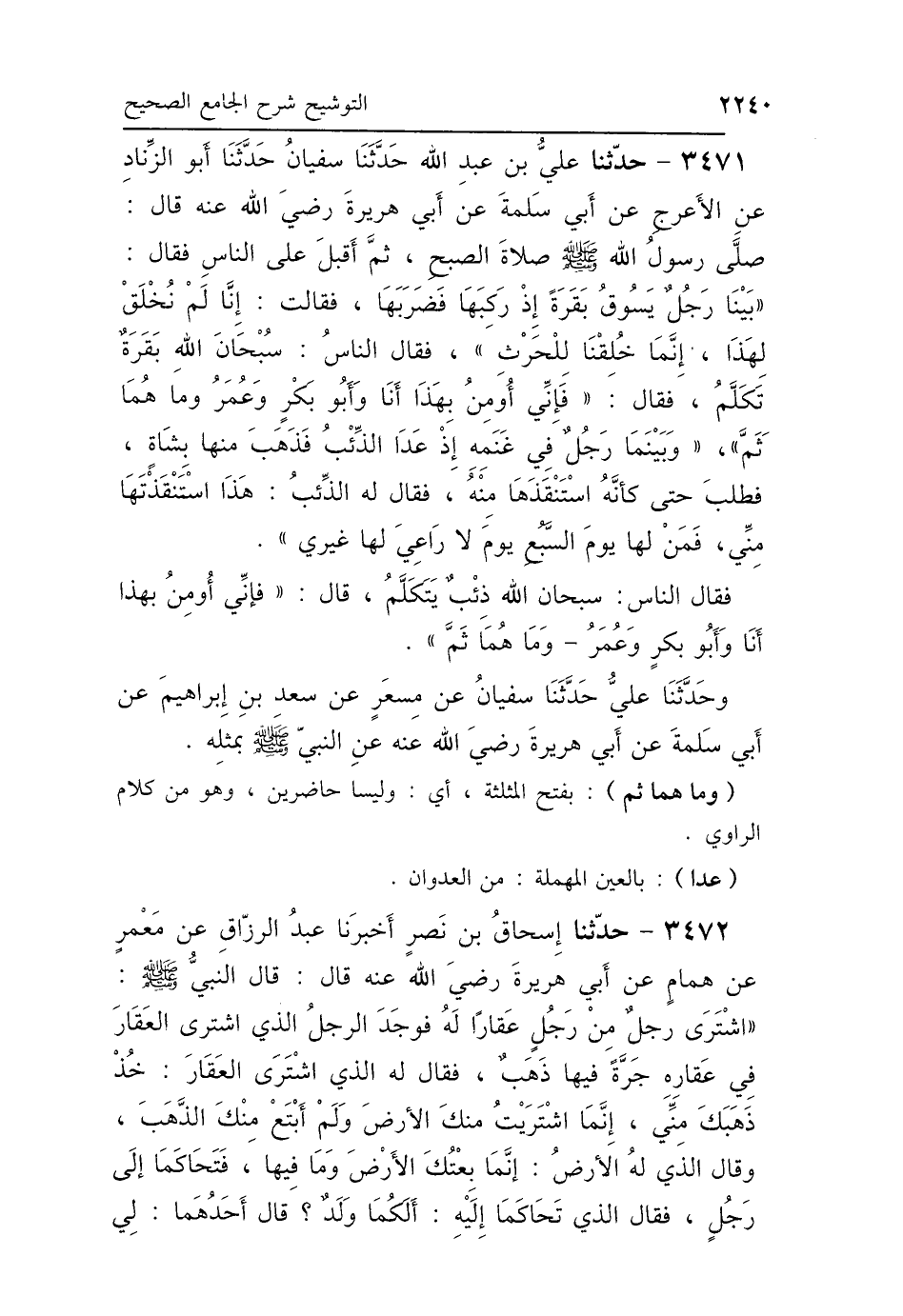 3471 - حَدَّثَنَا عَلِيُّ بْنُ عَبْدِ اللَّهِ، حَدَّثَنَا سُفْيَانُ، حَدَّثَنَا أَبُو الزِّنَادِ، عَنِ الأَعْرَجِ، عَنْ أَبِي سَلَمَةَ، عَنْ أَبِي هُرَيْرَةَ رَضِيَ اللَّهُ عَنْهُ، قَالَ: صَلَّى رَسُولُ اللَّهِ صَلَّى اللهُ عَلَيْهِ وَسَلَّمَ، صَلاَةَ الصُّبْحِ، ثُمَّ أَقْبَلَ عَلَى النَّاسِ، فَقَالَ: " بَيْنَا رَجُلٌ يَسُوقُ بَقَرَةً إِذْ رَكِبَهَا فَضَرَبَهَا، فَقَالَتْ: إِنَّا لَمْ نُخْلَقْ لِهَذَا، إِنَّمَا خُلِقْنَا لِلْحَرْثِ " فَقَالَ النَّاسُ: سُبْحَانَ اللَّهِ بَقَرَةٌ تَكَلَّمُ، فَقَالَ: " فَإِنِّي أُومِنُ بِهَذَا، أَنَا وَأَبُو بَكْرٍ، وَعُمَرُ، - وَمَا هُمَا ثَمَّ - وَبَيْنَمَا رَجُلٌ فِي غَنَمِهِ إِذْ عَدَا الذِّئْبُ، فَذَهَبَ مِنْهَا بِشَاةٍ، فَطَلَبَ حَتَّى كَأَنَّهُ اسْتَنْقَذَهَا مِنْهُ، فَقَالَ لَهُ الذِّئْبُ هَذَا: اسْتَنْقَذْتَهَا مِنِّي، فَمَنْ لَهَا يَوْمَ السَّبُعِ، يَوْمَ لاَ رَاعِيَ لَهَا غَيْرِي " فَقَالَ النَّاسُ: سُبْحَانَ اللَّهِ ذِئْبٌ يَتَكَلَّمُ، قَالَ: «فَإِنِّي أُومِنُ بِهَذَا أَنَا وَأَبُو بَكْرٍ وَعُمَرُ، - وَمَا هُمَا ثَمَّ -»، وحَدَّثَنَا عَلِيٌّ، حَدَّثَنَا سُفْيَانُ، عَنْ مِسْعَرٍ، عَنْ سَعْدِ بْنِ إِبْرَاهِيمَ، عَنْ أَبِي سَلَمَةَ، عَنْ أَبِي هُرَيْرَةَ، عَنِ النَّبِيِّ صَلَّى اللهُ عَلَيْهِ وَسَلَّمَ: بِمِثْلِهِ.