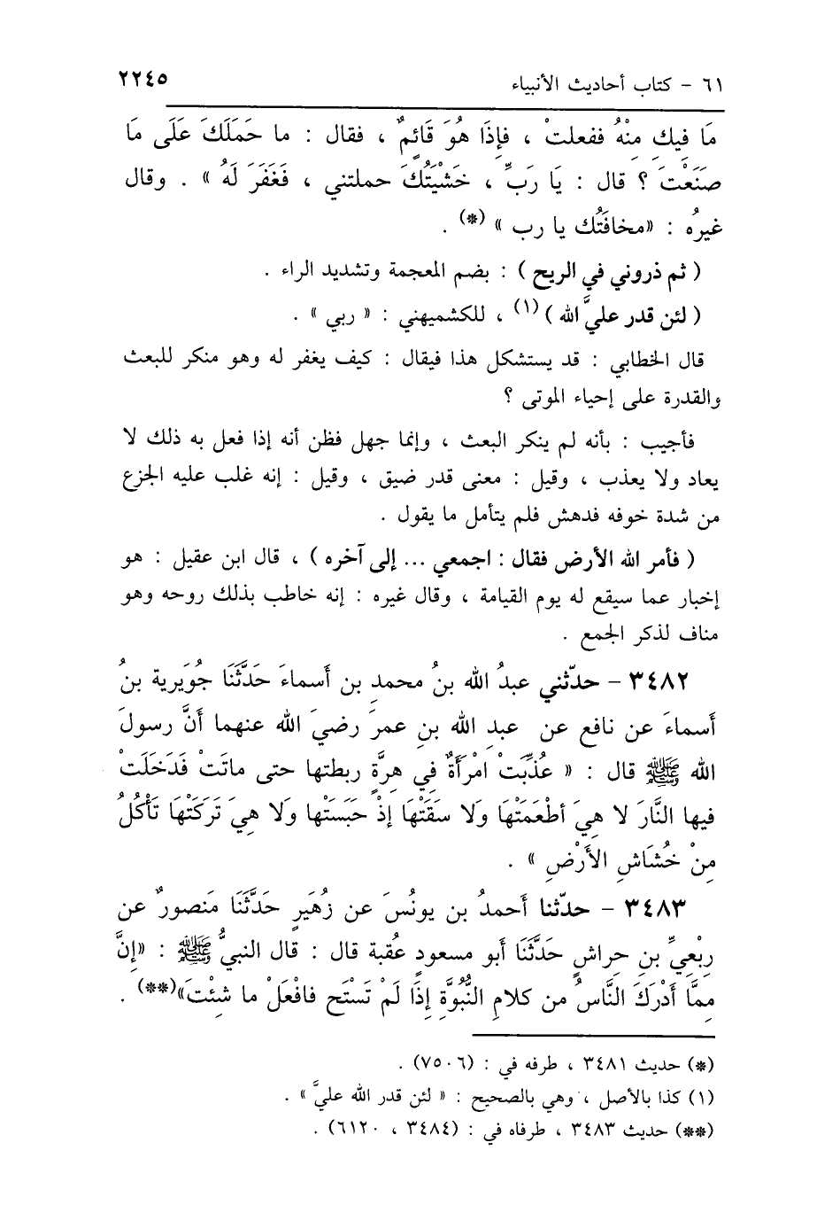 مَا فِيكِ مِنْهُ، فَفَعَلَتْ، فَإِذَا هُوَ قَائِمٌ، فَقَالَ: مَا حَمَلَكَ عَلَى مَا صَنَعْتَ؟ قَالَ: يَا رَبِّ خَشْيَتُكَ، فَغَفَرَ لَهُ " وَقَالَ غَيْرُهُ: «مَخَافَتُكَ يَا رَبِّ».