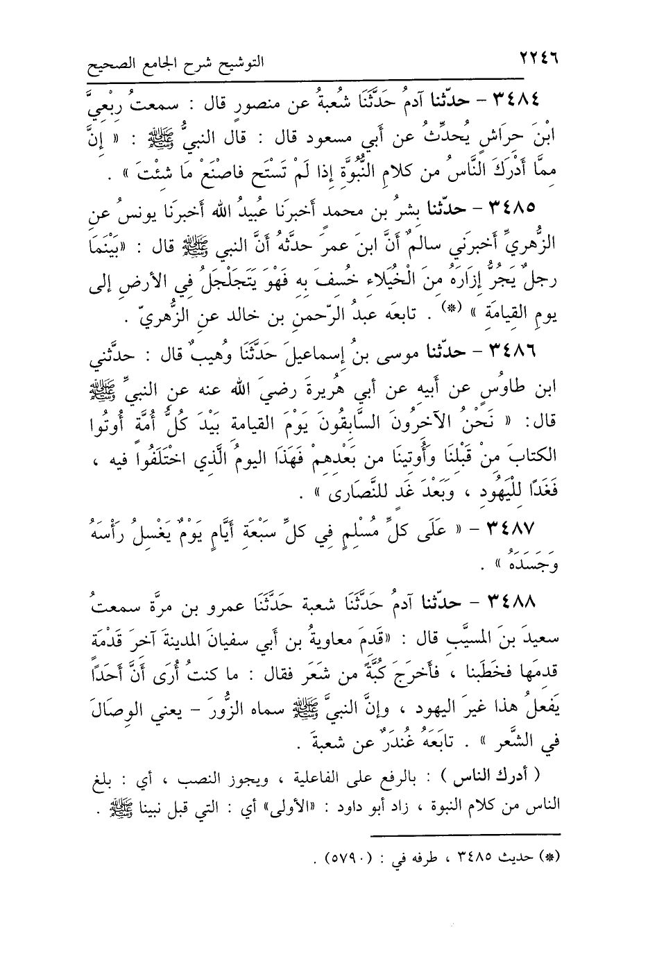 3484 - حَدَّثَنَا آدَمُ، حَدَّثَنَا شُعْبَةُ، عَنْ مَنْصُورٍ، قَالَ: سَمِعْتُ رِبْعِيَّ بْنَ حِرَاشٍ، يُحَدِّثُ عَنْ أَبِي مَسْعُودٍ، قَالَ النَّبِيُّ صَلَّى اللهُ عَلَيْهِ وَسَلَّمَ: «إِنَّ مِمَّا أَدْرَكَ النَّاسُ مِنْ كَلاَمِ النُّبُوَّةِ، إِذَا لَمْ تَسْتَحْيِ فَاصْنَعْ مَا شِئْتَ».