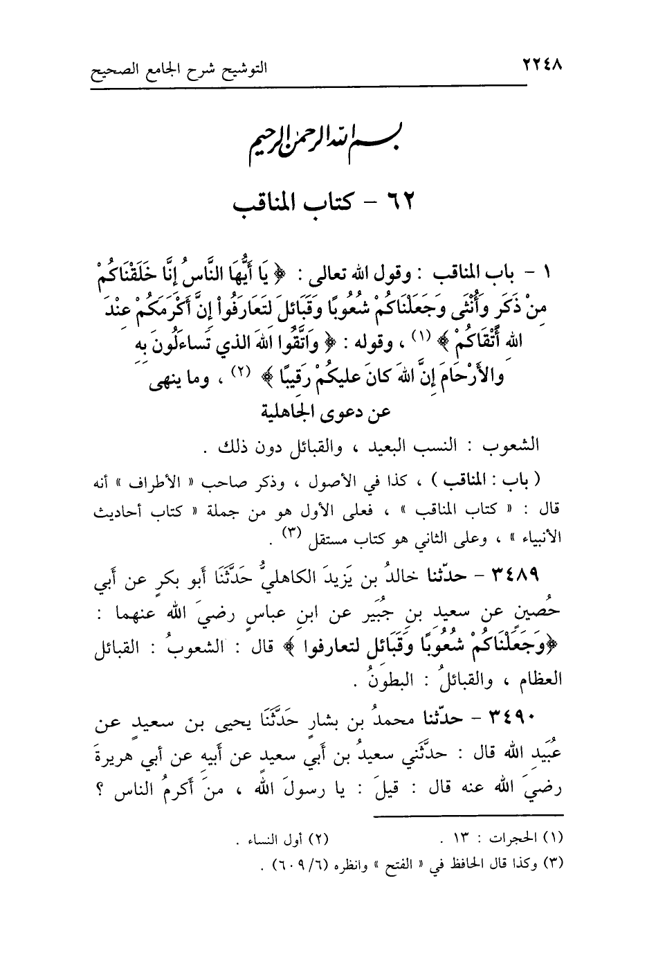 1 - بَابُ قَوْلِ اللَّهِ تَعَالَى: {يَا أَيُّهَا النَّاسُ إِنَّا خَلَقْنَاكُمْ مِنْ ذَكَرٍ وَأُنْثَى وَجَعَلْنَاكُمْ شُعُوبًا وَقَبَائِلَ لِتَعَارَفُوا إِنَّ أَكْرَمَكُمْ عِنْدَ اللَّهِ أَتْقَاكُمْ} [الحجرات: 13]