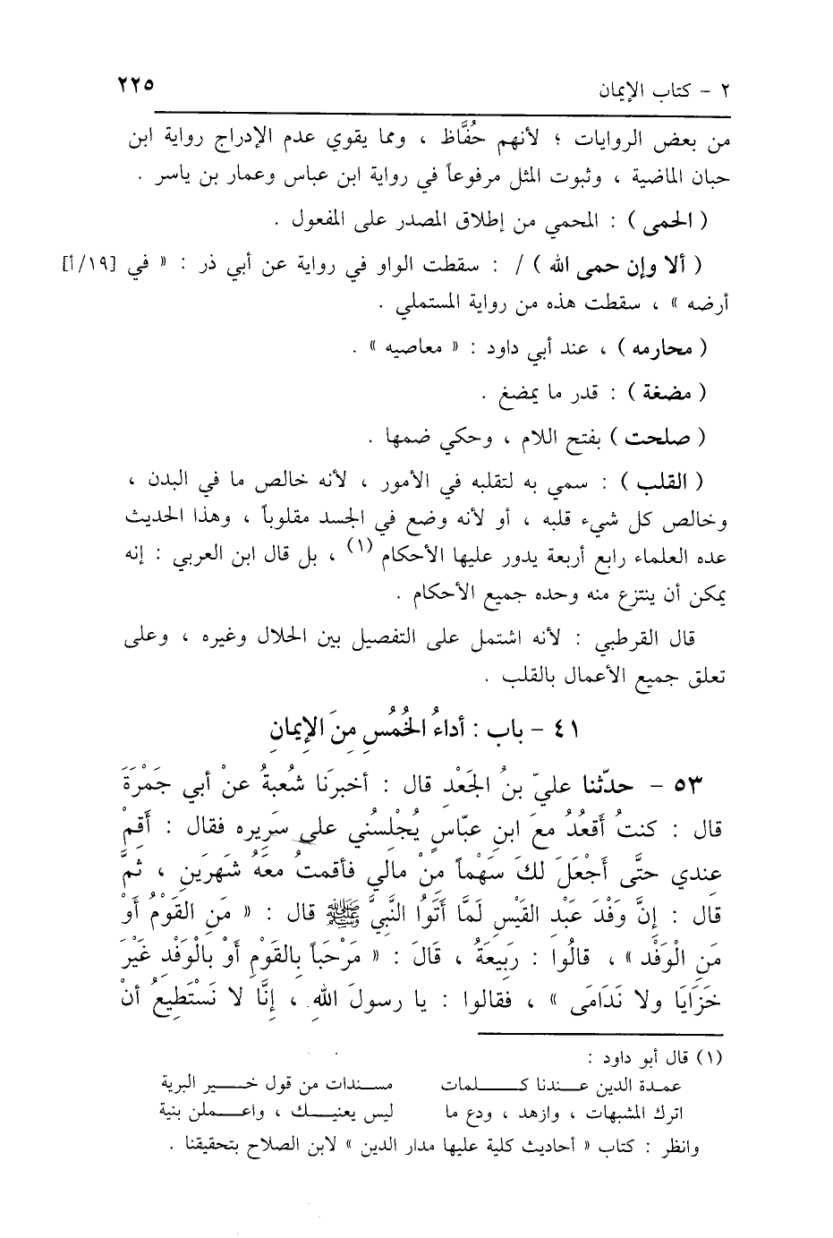 (القلب): سمي به لتقلبه في الأمور، لأنه خالص ما في البدن، وخالص كل شيء قلبه، أو لأنه وضع في الجسد مقلوبًا، وهذا الحديث عده العلماء رابع أربعة يدور عليها الأحكام، بل قال ابن العربي: إنه يمكن أن ينتزع منه وحده جميع الأحكام.