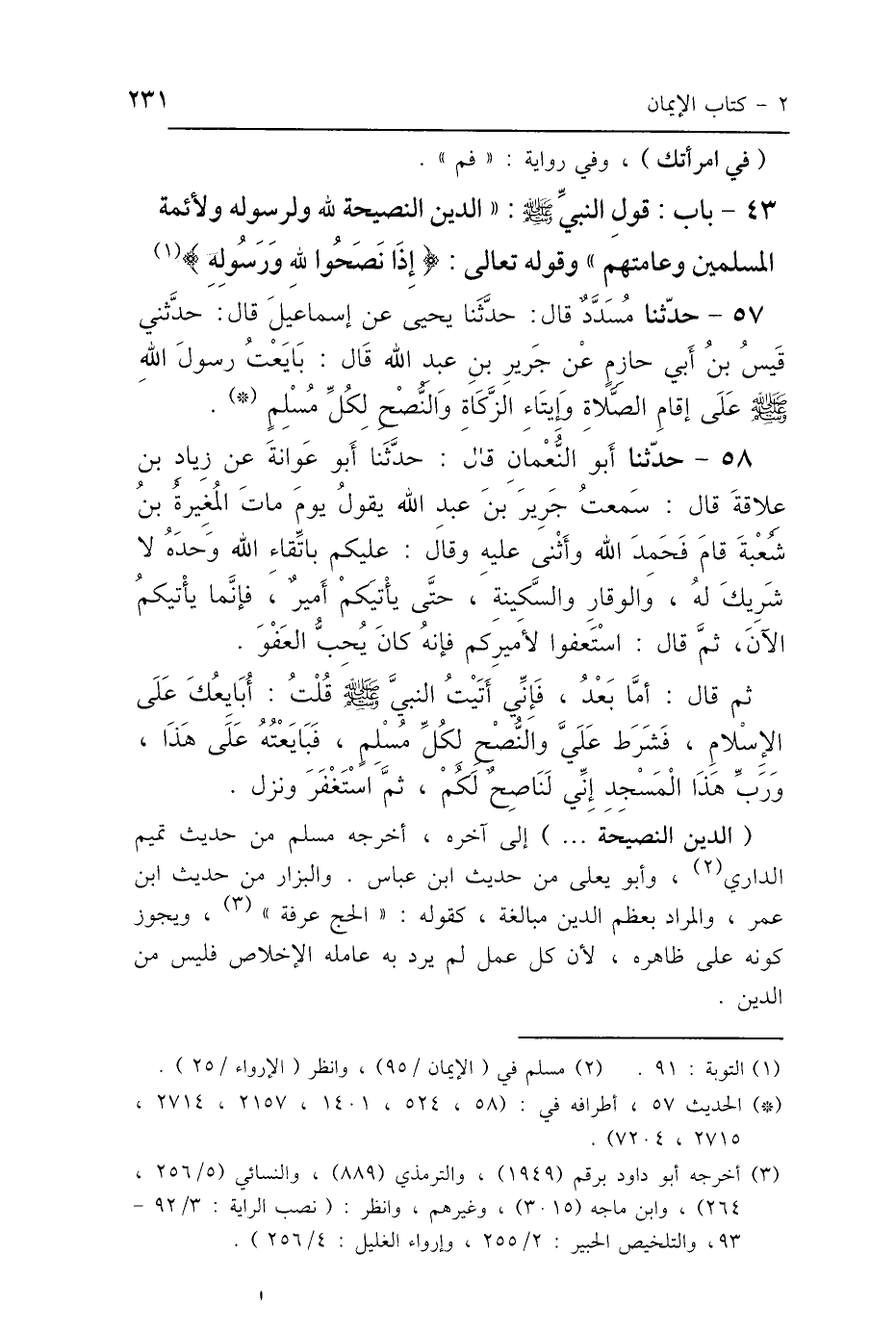 43 - بَابُ قَوْلِ النَّبِيِّ صَلَّى اللهُ عَلَيْهِ وَسَلَّمَ: " الدِّينُ النَّصِيحَةُ: لِلَّهِ وَلِرَسُولِهِ وَلِأَئِمَّةِ المُسْلِمِينَ وَعَامَّتِهِمْ" وَقَوْلِهِ تَعَالَى: {إِذَا نَصَحُوا لِلَّهِ وَرَسُولِهِ} [التوبة: 91]