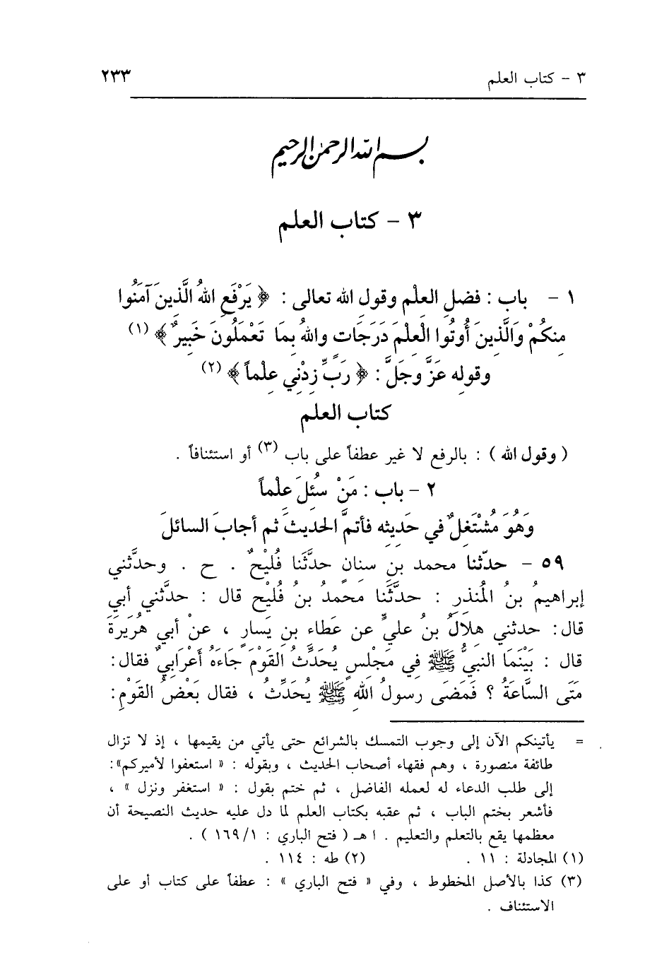 1 - بَابُ فَضْلِ العِلْمِ وَقَوْلِ اللَّهِ تَعَالَى: {يَرْفَعِ اللَّهُ الَّذِينَ آمَنُوا مِنْكُمْ وَالَّذِينَ أُوتُوا العِلْمَ دَرَجَاتٍ وَاللَّهُ بِمَا تَعْمَلُونَ خَبِيرٌ} [المجادلة: 11] وَقَوْلِهِ عَزَّ وَجَلَّ: {وَقُلْ رَبِّ زِدْنِي عِلْمًا} [طه: 114]
