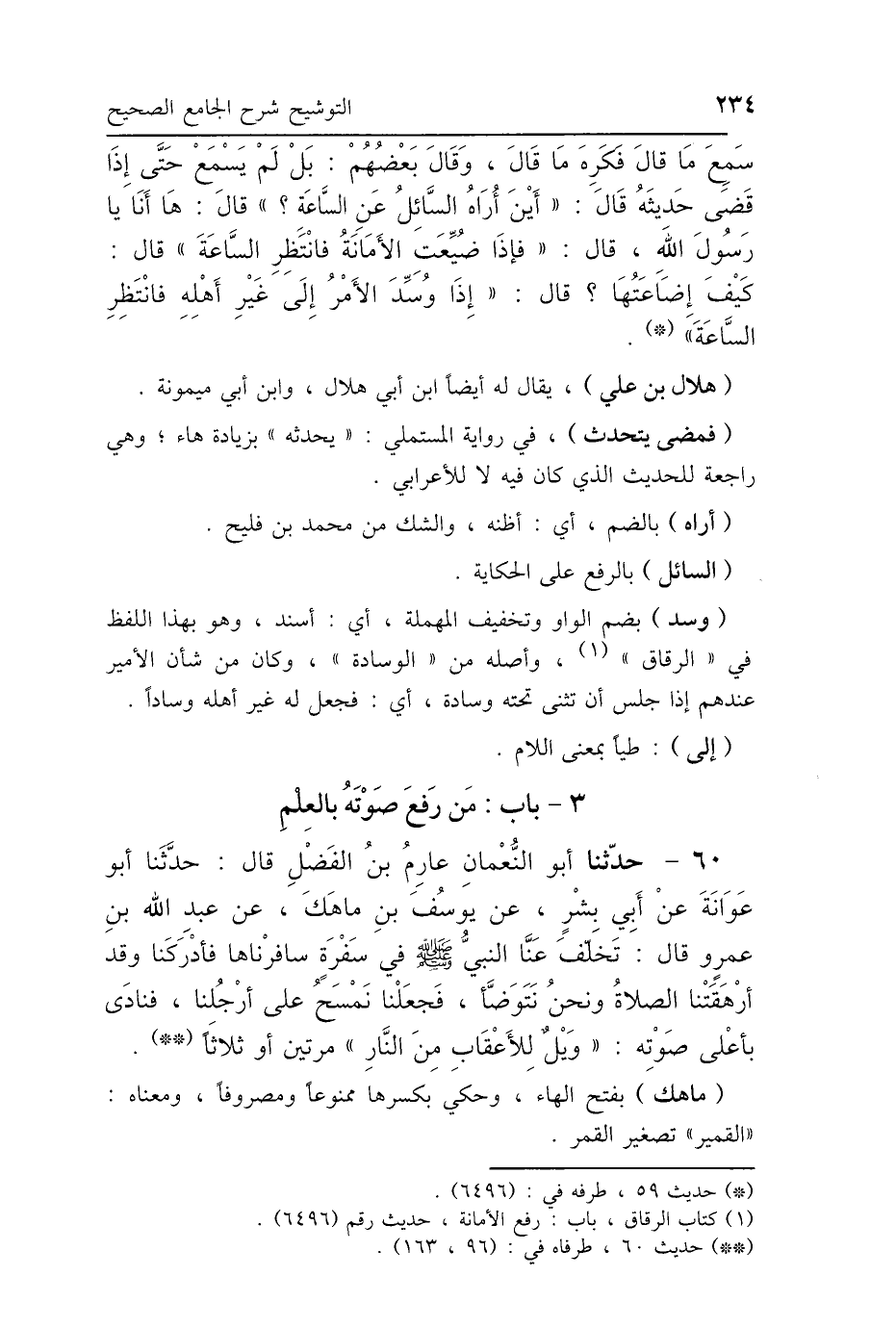 سَمِعَ مَا قَالَ فَكَرِهَ مَا قَالَ. وَقَالَ بَعْضُهُمْ: بَلْ لَمْ يَسْمَعْ، حَتَّى إِذَا قَضَى حَدِيثَهُ قَالَ: «أَيْنَ - أُرَاهُ - السَّائِلُ عَنِ السَّاعَةِ» قَالَ: هَا أَنَا يَا رَسُولَ اللَّهِ، قَالَ: «فَإِذَا ضُيِّعَتِ الأَمَانَةُ فَانْتَظِرِ السَّاعَةَ»، قَالَ: كَيْفَ إِضَاعَتُهَا؟ قَالَ: «إِذَا وُسِّدَ الأَمْرُ إِلَى غَيْرِ أَهْلِهِ فَانْتَظِرِ السَّاعَةَ».