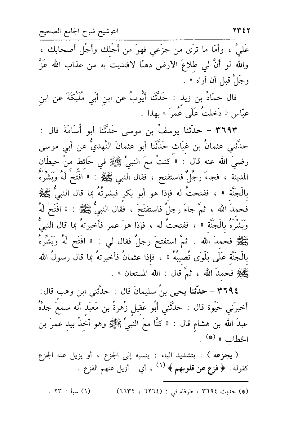 3693 - حَدَّثَنَا يُوسُفُ بْنُ مُوسَى، حَدَّثَنَا أَبُو أُسَامَةَ، قَالَ: حَدَّثَنِي عُثْمَانُ بْنُ غِيَاثٍ، حَدَّثَنَا أَبُو عُثْمَانَ النَّهْدِيُّ، عَنْ أَبِي مُوسَى رَضِيَ اللَّهُ عَنْهُ، قَالَ: كُنْتُ مَعَ النَّبِيِّ صَلَّى اللهُ عَلَيْهِ وَسَلَّمَ فِي حَائِطٍ مِنْ حِيطَانِ المَدِينَةِ فَجَاءَ رَجُلٌ فَاسْتَفْتَحَ، فَقَالَ النَّبِيُّ صَلَّى اللهُ عَلَيْهِ وَسَلَّمَ: «افْتَحْ لَهُ وَبَشِّرْهُ بِالْجَنَّةِ» فَفَتَحْتُ لَهُ، فَإِذَا أَبُو بَكْرٍ، فَبَشَّرْتُهُ بِمَا قَالَ النَّبِيُّ صَلَّى اللهُ عَلَيْهِ وَسَلَّمَ، فَحَمِدَ اللَّهَ، ثُمَّ جَاءَ رَجُلٌ فَاسْتَفْتَحَ، فَقَالَ النَّبِيُّ صَلَّى اللهُ عَلَيْهِ وَسَلَّمَ: «افْتَحْ لَهُ وَبَشِّرْهُ بِالْجَنَّةِ»، فَفَتَحْتُ لَهُ فَإِذَا هُوَ عُمَرُ، فَأَخْبَرْتُهُ بِمَا قَالَ النَّبِيُّ صَلَّى اللهُ عَلَيْهِ وَسَلَّمَ، فَحَمِدَ اللَّهَ، ثُمَّ اسْتَفْتَحَ رَجُلٌ، فَقَالَ لِي: «افْتَحْ لَهُ وَبَشِّرْهُ بِالْجَنَّةِ، عَلَى بَلْوَى تُصِيبُهُ»، فَإِذَا عُثْمَانُ، فَأَخْبَرْتُهُ بِمَا قَالَ رَسُولُ اللَّهِ صَلَّى اللهُ عَلَيْهِ وَسَلَّمَ فَحَمِدَ اللَّهَ، ثُمَّ قَالَ: اللَّهُ المُسْتَعَانُ.