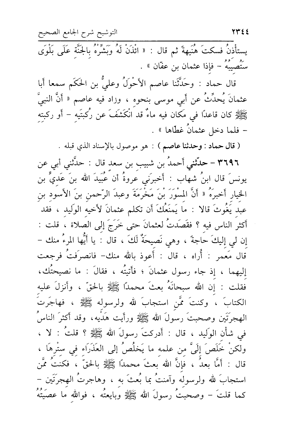 3696 - حَدَّثَنِي أَحْمَدُ بْنُ شَبِيبِ بْنِ سَعِيدٍ، قَالَ: حَدَّثَنِي أَبِي، عَنْ يُونُسَ، قَالَ ابْنُ شِهَابٍ: أَخْبَرَنِي عُرْوَةُ، أَنَّ عُبَيْدَ اللَّهِ بْنَ عَدِيِّ بْنِ الخِيَارِ، أَخْبَرَهُ أَنَّ المِسْوَرَ بْنَ مَخْرَمَةَ، وَعَبْدَ الرَّحْمَنِ بْنَ الأَسْوَدِ بْنِ عَبْدِ يَغُوثَ، قَالاَ: مَا يَمْنَعُكَ أَنْ تُكَلِّمَ عُثْمَانَ لِأَخِيهِ الوَلِيدِ، فَقَدْ أَكْثَرَ النَّاسُ فِيهِ، فَقَصَدْتُ لِعُثْمَانَ حَتَّى خَرَجَ إِلَى الصَّلاَةِ، قُلْتُ: إِنَّ لِي إِلَيْكَ حَاجَةً، وَهِيَ نَصِيحَةٌ لَكَ، قَالَ: يَا أَيُّهَا المَرْءُ - قَالَ مَعْمَرٌ أُرَاهُ قَالَ: أَعُوذُ بِاللَّهِ مِنْكَ - فَانْصَرَفْتُ، فَرَجَعْتُ إِلَيْهِمْ إِذْ جَاءَ رَسُولُ عُثْمَانَ فَأَتَيْتُهُ، فَقَالَ: مَا نَصِيحَتُكَ؟ فَقُلْتُ: " إِنَّ اللَّهَ سُبْحَانَهُ بَعَثَ مُحَمَّدًا صَلَّى اللهُ عَلَيْهِ وَسَلَّمَ بِالحَقِّ، وَأَنْزَلَ عَلَيْهِ الكِتَابَ، وَكُنْتَ مِمَّنِ اسْتَجَابَ لِلَّهِ وَلِرَسُولِهِ صَلَّى اللهُ عَلَيْهِ وَسَلَّمَ، فَهَاجَرْتَ الهِجْرَتَيْنِ، وَصَحِبْتَ رَسُولَ اللَّهِ صَلَّى اللهُ عَلَيْهِ وَسَلَّمَ، وَرَأَيْتَ هَدْيَهُ وَقَدْ أَكْثَرَ النَّاسُ فِي شَأْنِ الوَلِيدِ، قَالَ: أَدْرَكْتَ رَسُولَ اللَّهِ صَلَّى اللهُ عَلَيْهِ وَسَلَّمَ؟ قُلْتُ: لاَ، وَلَكِنْ خَلَصَ إِلَيَّ مِنْ عِلْمِهِ مَا يَخْلُصُ إِلَى العَذْرَاءِ فِي سِتْرِهَا، قَالَ: أَمَّا بَعْدُ، فَإِنَّ اللَّهَ بَعَثَ مُحَمَّدًا صَلَّى اللهُ عَلَيْهِ وَسَلَّمَ بِالحَقِّ، فَكُنْتُ مِمَّنِ اسْتَجَابَ لِلَّهِ وَلِرَسُولِهِ، وَآمَنْتُ بِمَا بُعِثَ بِهِ، وَهَاجَرْتُ الهِجْرَتَيْنِ، كَمَا قُلْتَ، وَصَحِبْتُ رَسُولَ اللَّهِ صَلَّى اللهُ عَلَيْهِ وَسَلَّمَ وَبَايَعْتُهُ، فَوَاللَّهِ مَا عَصَيْتُهُ