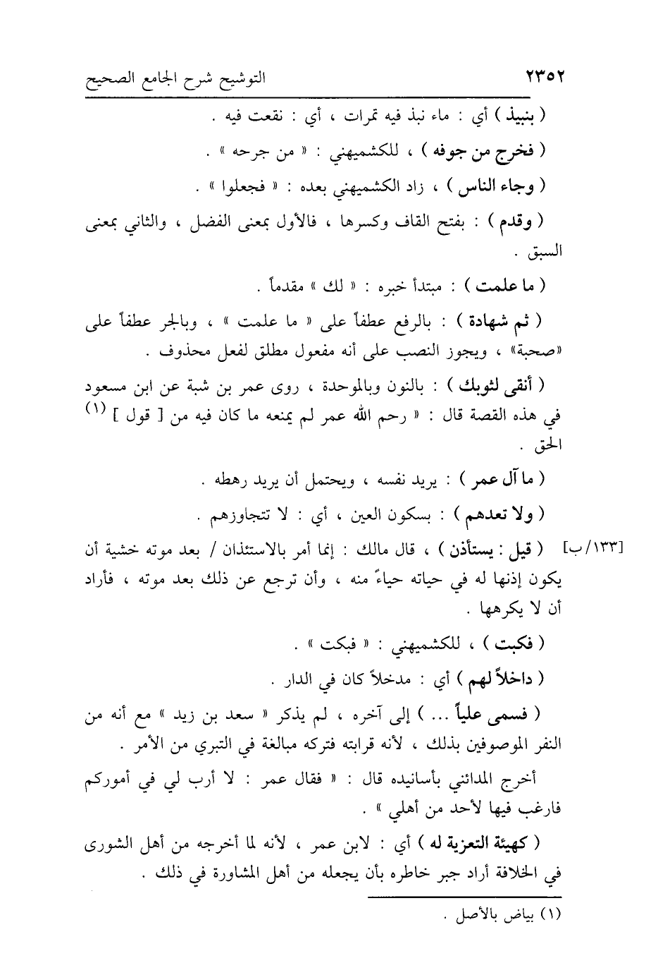 (أنقى لثوبك): بالنون وبالموحدة، روى عمر بن شبة عن ابن مسعود في هذه القصة قال: "رحم الله عمر لم يمنعه ما كان فيه من [قول] الحق.
