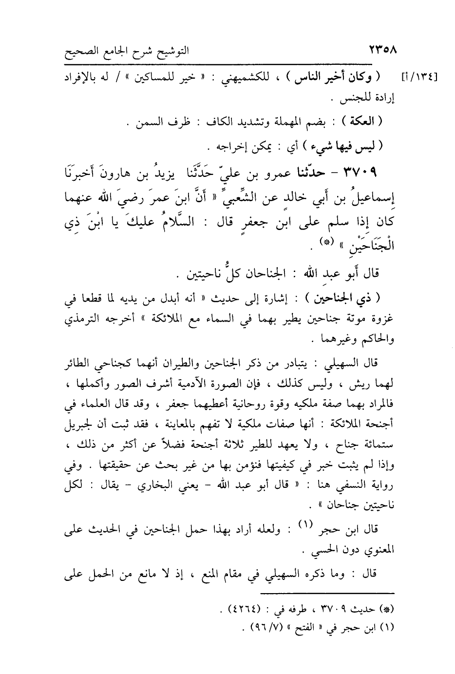 (ذي الجناحين): إشارة إلى حديث "أنه أبدل من يديه لما قطعا في غزوة موتة جناحين يطير بهما في السماء مع الملائكة" أخرجه الترمذي والحاكم وغيرهما.