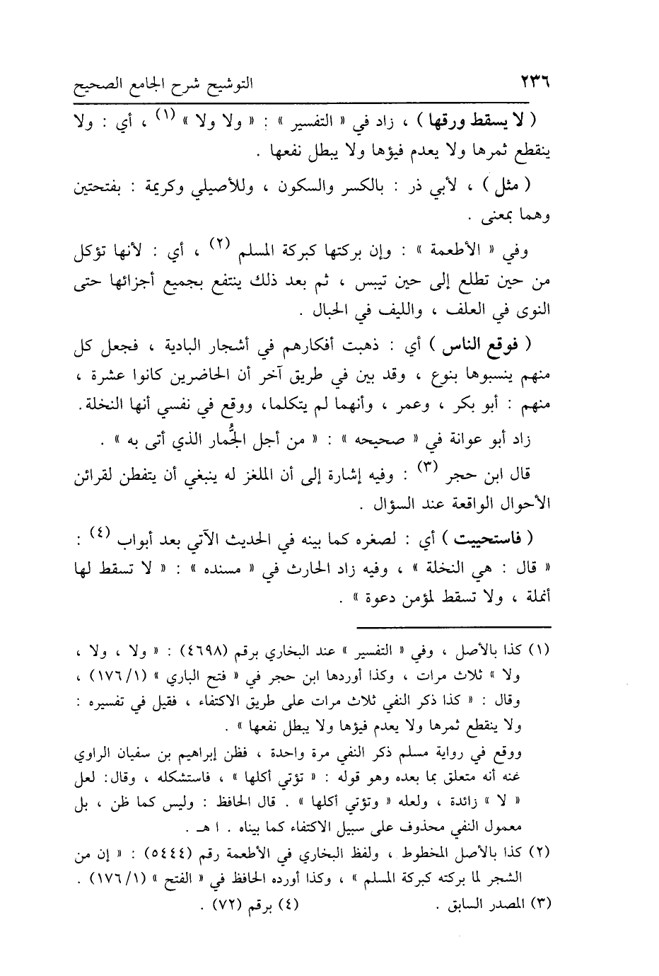 (لا يسقط ورقها)، زاد في "التفسير": "ولا ولا"، أي: ولا ينقطع ثمرها ولا يعدم فيؤها ولا يبطل نفعها.