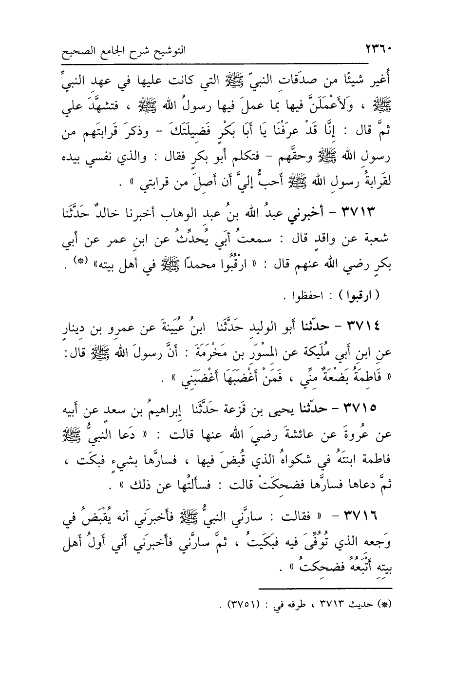 3714 - حَدَّثَنَا أَبُو الوَلِيدِ، حَدَّثَنَا ابْنُ عُيَيْنَةَ، عَنْ عَمْرِو بْنِ دِينَارٍ، عَنِ ابْنِ أَبِي مُلَيْكَةَ، عَنِ المِسْوَرِ بْنِ مَخْرَمَةَ، أَنَّ رَسُولَ اللَّهِ صَلَّى اللهُ عَلَيْهِ وَسَلَّمَ، قَالَ: «فَاطِمَةُ بَضْعَةٌ مِنِّي، فَمَنْ أَغْضَبَهَا أَغْضَبَنِي».