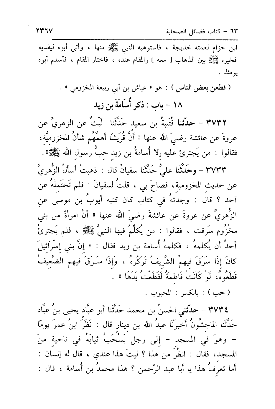 3732 - حَدَّثَنَا قُتَيْبَةُ بْنُ سَعِيدٍ، حَدَّثَنَا لَيْثٌ، عَنِ الزُّهْرِيِّ، عَنْ عُرْوَةَ، عَنْ عَائِشَةَ، رَضِيَ اللَّهُ عَنْهَا، أَنَّ قُرَيْشًا أَهَمَّهُمْ شَأْنُ المَخْزُومِيَّةِ، فَقَالُوا: مَنْ يَجْتَرِئُ عَلَيْهِ إِلَّا أُسَامَةُ بْنُ زَيْدٍ حِبُّ رَسُولِ اللَّهِ صَلَّى اللهُ عَلَيْهِ وَسَلَّمَ، ح.