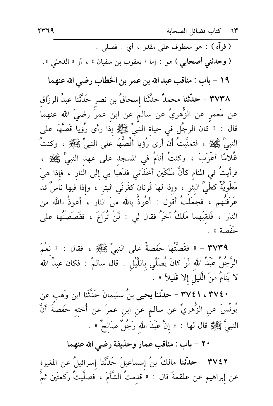 3739 - فَقَصَّتْهَا حَفْصَةُ عَلَى النَّبِيِّ صَلَّى اللهُ عَلَيْهِ وَسَلَّمَ، فَقَالَ: «نِعْمَ الرَّجُلُ عَبْدُ اللَّهِ لَوْ كَانَ يُصَلِّي بِاللَّيْلِ» قَالَ سَالِمٌ: «فَكَانَ عَبْدُ اللَّهِ لاَ يَنَامُ مِنَ اللَّيْلِ إِلَّا قَلِيلًا».