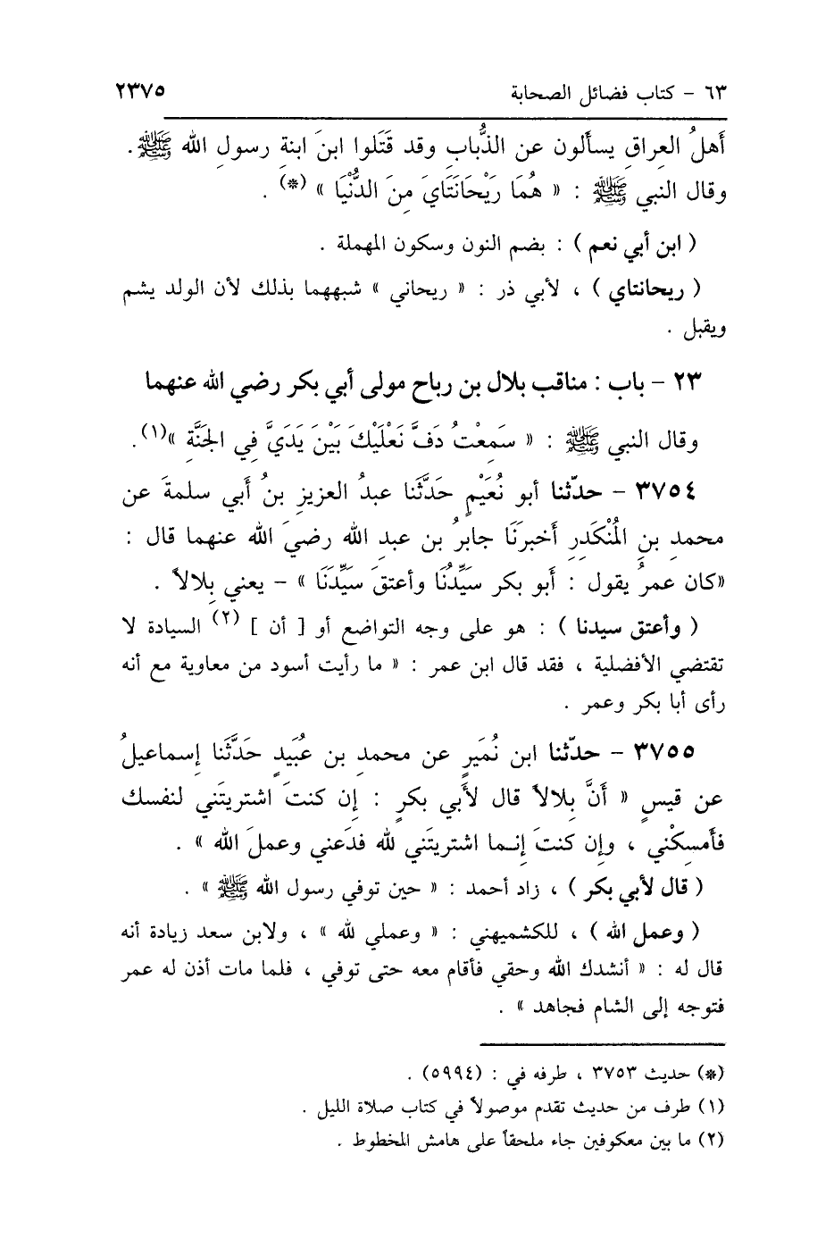 3754 - حَدَّثَنَا أَبُو نُعَيْمٍ، حَدَّثَنَا عَبْدُ العَزِيزِ بْنُ أَبِي سَلَمَةَ، عَنْ مُحَمَّدِ بْنِ المُنْكَدِرِ، أَخْبَرَنَا جَابِرُ بْنُ عَبْدِ اللَّهِ رَضِيَ اللَّهُ عَنْهُمَا، قَالَ: كَانَ عُمَرُ يَقُولُ: «أَبُو بَكْرٍ سَيِّدُنَا، وَأَعْتَقَ سَيِّدَنَا يَعْنِي بِلاَلًا».