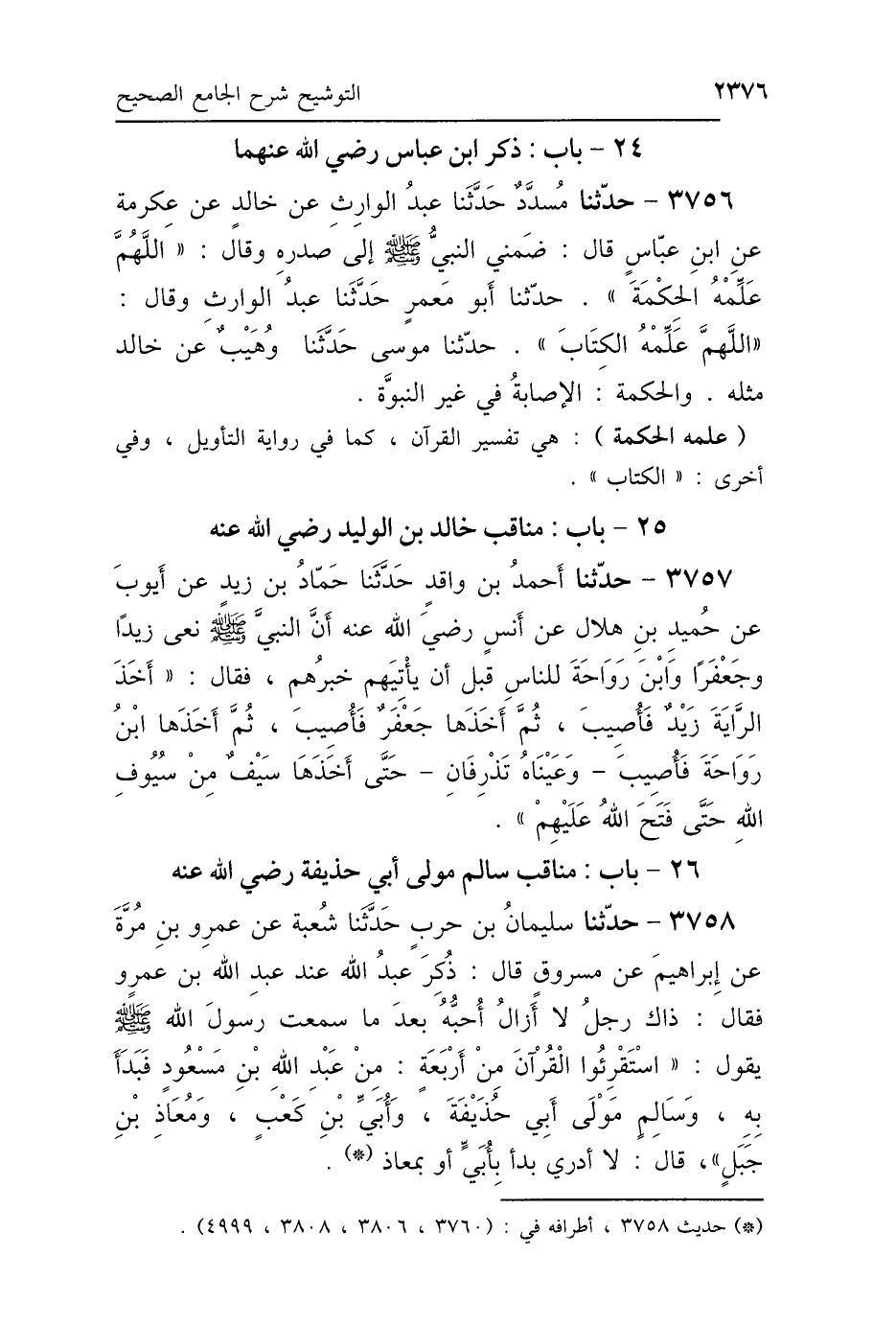 3756 - حَدَّثَنَا مُسَدَّدٌ، حَدَّثَنَا عَبْدُ الوَارِثِ، عَنْ خَالِدٍ، عَنْ عِكْرِمَةَ، عَنِ ابْنِ عَبَّاسٍ، قَالَ: ضَمَّنِي النَّبِيُّ صَلَّى اللهُ عَلَيْهِ وَسَلَّمَ إِلَى صَدْرِهِ، وَقَالَ: «اللَّهُمَّ عَلِّمْهُ الحِكْمَةَ» حَدَّثَنَا أَبُو مَعْمَرٍ، حَدَّثَنَا عَبْدُ الوَارِثِ، وَقَالَ: «عَلِّمْهُ الكِتَابَ»، حَدَّثَنَا مُوسَى، حَدَّثَنَا وُهَيْبٌ، عَنْ خَالِدٍ مِثْلَهُ، " وَالحِكْمَةُ: الإِصَابَةُ فِي غَيْرِ النُّبُوَّةِ".