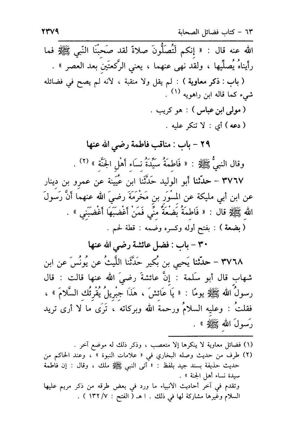 (باب: ذكر معاوية): لم يقل ولا منقبة، لأنه لم يصح في فضائله شيء كما قاله ابن راهويه.