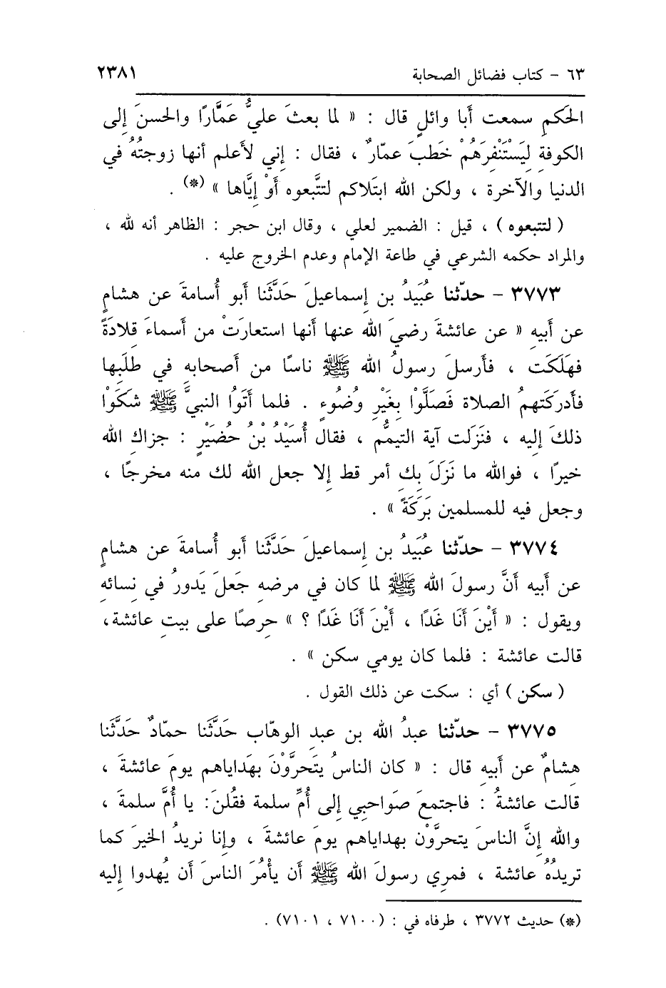 3775 - حَدَّثَنَا عَبْدُ اللَّهِ بْنُ عَبْدِ الوَهَّابِ، حَدَّثَنَا حَمَّادٌ، حَدَّثَنَا هِشَامٌ، عَنْ أَبِيهِ، قَالَ: كَانَ النَّاسُ يَتَحَرَّوْنَ بِهَدَايَاهُمْ يَوْمَ عَائِشَةَ، قَالَتْ عَائِشَةُ: فَاجْتَمَعَ صَوَاحِبِي إِلَى أُمِّ سَلَمَةَ، فَقُلْنَ: يَا أُمَّ سَلَمَةَ، وَاللَّهِ إِنَّ النَّاسَ يَتَحَرَّوْنَ بِهَدَايَاهُمْ يَوْمَ عَائِشَةَ، وَإِنَّا نُرِيدُ الخَيْرَ كَمَا تُرِيدُهُ عَائِشَةُ، فَمُرِي رَسُولَ اللَّهِ صَلَّى اللهُ عَلَيْهِ وَسَلَّمَ أَنْ يَأْمُرَ النَّاسَ أَنْ يُهْدُوا إِلَيْهِ
