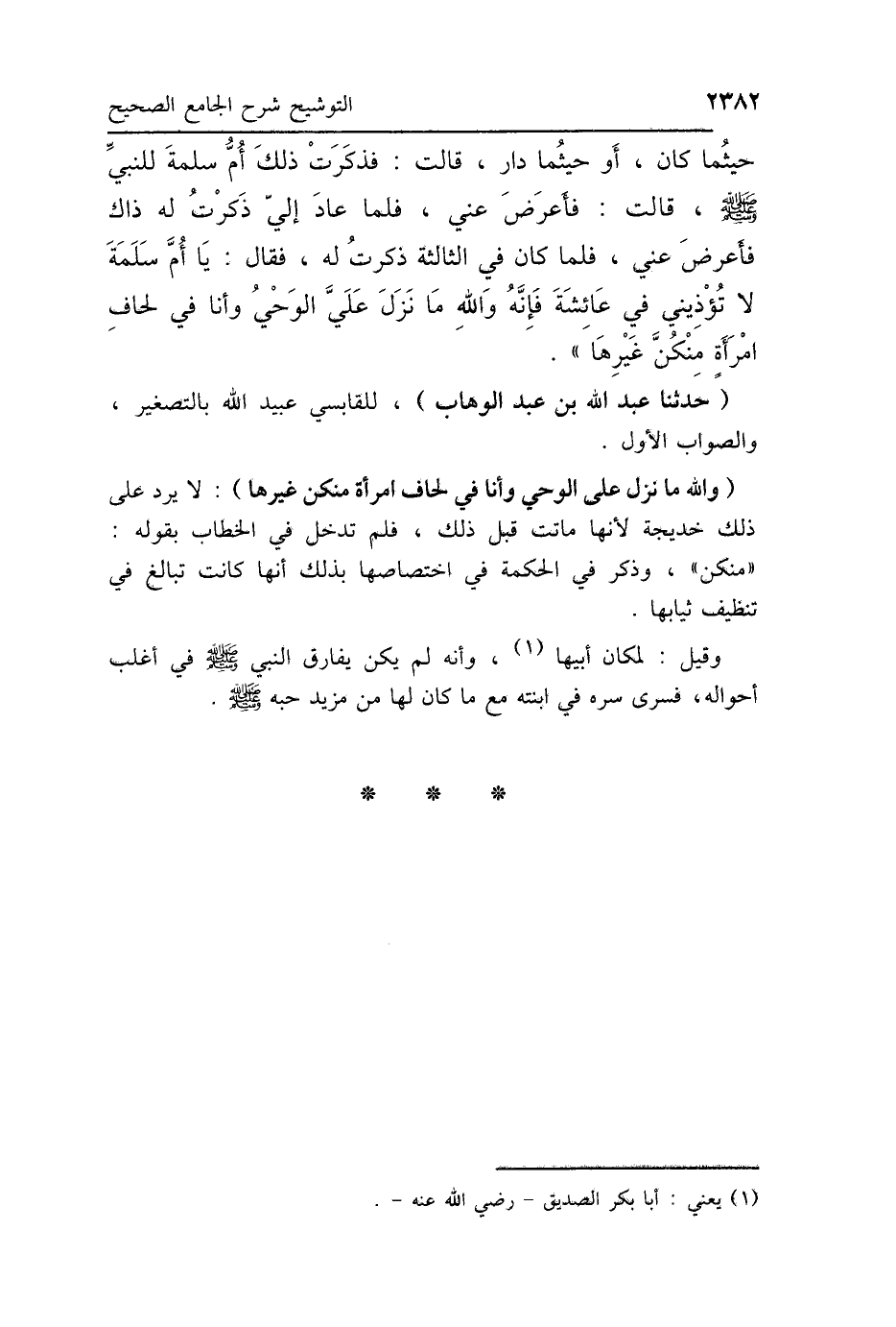 (والله ما نزل على الوحي وأنا في لحاف امرأة منكن غيرها): لا يرد على ذلك خديجة لأنها ماتت قبل ذلك، فلم تدخل في الخطاب بقوله "منكن"، وذكر في الحكمة في اختصاصها بذلك أنها كانت تبالغ في تنظيف ثيابها.