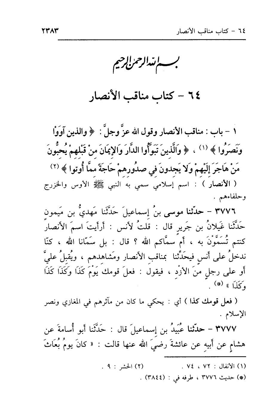 1 - بَابُ مَنَاقِبِ الأَنْصَارِ وقول الله عز وجل: {وَالَّذِينَ تَبَوَّءُوا الدَّارَ وَالإِيمَانَ مِنْ قَبْلِهِمْ يُحِبُّونَ مَنْ هَاجَرَ إِلَيْهِمْ وَلاَ يَجِدُونَ فِي صُدُورِهِمْ حَاجَةً مِمَّا أُوتُوا}