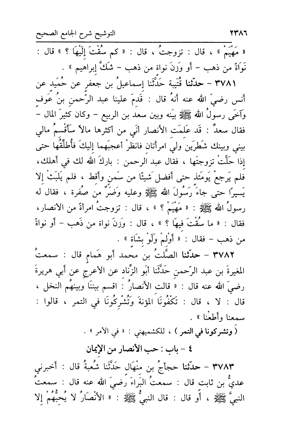 3781 - حَدَّثَنَا قُتَيْبَةُ، حَدَّثَنَا إِسْمَاعِيلُ بْنُ جَعْفَرٍ، عَنْ حُمَيْدٍ، عَنْ أَنَسٍ رَضِيَ اللَّهُ عَنْهُ، أَنَّهُ قَالَ: قَدِمَ عَلَيْنَا عَبْدُ الرَّحْمَنِ بْنُ عَوْفٍ، وَآخَى رَسُولُ اللَّهِ صَلَّى اللهُ عَلَيْهِ وَسَلَّمَ بَيْنَهُ وَبَيْنَ سَعْدِ بْنِ الرَّبِيعِ، وَكَانَ كَثِيرَ المَالِ، فَقَالَ سَعْدٌ: قَدْ عَلِمَتِ الأَنْصَارُ أَنِّي مِنْ أَكْثَرِهَا مَالًا، سَأَقْسِمُ مَالِي بَيْنِي وَبَيْنَكَ شَطْرَيْنِ، وَلِي امْرَأَتَانِ فَانْظُرْ أَعْجَبَهُمَا إِلَيْكَ فَأُطَلِّقُهَا، حَتَّى إِذَا حَلَّتْ تَزَوَّجْتَهَا، فَقَالَ عَبْدُ الرَّحْمَنِ: بَارَكَ اللَّهُ لَكَ فِي أَهْلِكَ، فَلَمْ يَرْجِعْ يَوْمَئِذٍ حَتَّى أَفْضَلَ شَيْئًا مِنْ سَمْنٍ وَأَقِطٍ، فَلَمْ يَلْبَثْ إِلَّا يَسِيرًا حَتَّى جَاءَ رَسُولَ اللَّهِ صَلَّى اللهُ عَلَيْهِ وَسَلَّمَ وَعَلَيْهِ، وَضَرٌ مِنْ صُفْرَةٍ، فَقَالَ لَهُ رَسُولُ اللَّهِ صَلَّى اللهُ عَلَيْهِ وَسَلَّمَ: «مَهْيَمْ». قَالَ: تَزَوَّجْتُ امْرَأَةً مِنَ الأَنْصَارِ، فَقَالَ «مَا سُقْتَ إِلَيْهَا؟». قَالَ: وَزْنَ نَوَاةٍ مِنْ ذَهَبٍ، أَوْ نَوَاةً مِنْ ذَهَبٍ، فَقَالَ: «أَوْلِمْ وَلَوْ بِشَاةٍ».