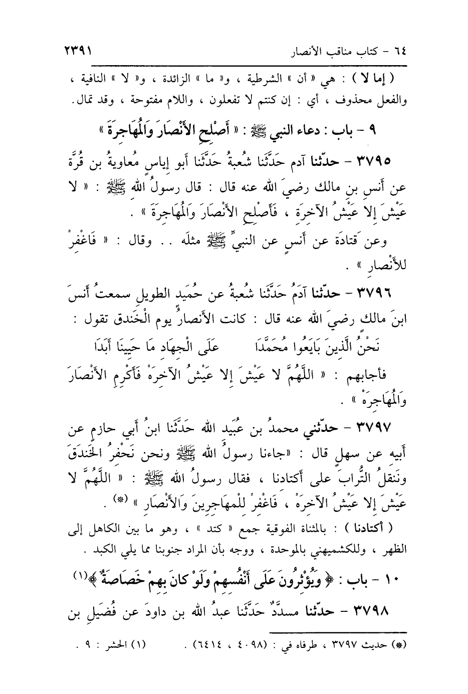 3797 - حَدَّثَنِي مُحَمَّدُ بْنُ عُبَيْدِ اللَّهِ، حَدَّثَنَا ابْنُ أَبِي حَازِمٍ، عَنْ أَبِيهِ، عَنْ سَهْلٍ، قَالَ: جَاءَنَا رَسُولُ اللَّهِ صَلَّى اللهُ عَلَيْهِ وَسَلَّمَ وَنَحْنُ نَحْفِرُ الخَنْدَقَ، وَنَنْقُلُ التُّرَابَ عَلَى أَكْتَادِنَا، فَقَالَ رَسُولُ اللَّهِ صَلَّى اللهُ عَلَيْهِ وَسَلَّمَ: «اللَّهُمَّ لاَ عَيْشَ إِلَّا عَيْشُ الآخِرَهْ، فَاغْفِرْ لِلْمُهَاجِرِينَ وَالأَنْصَارِ».
