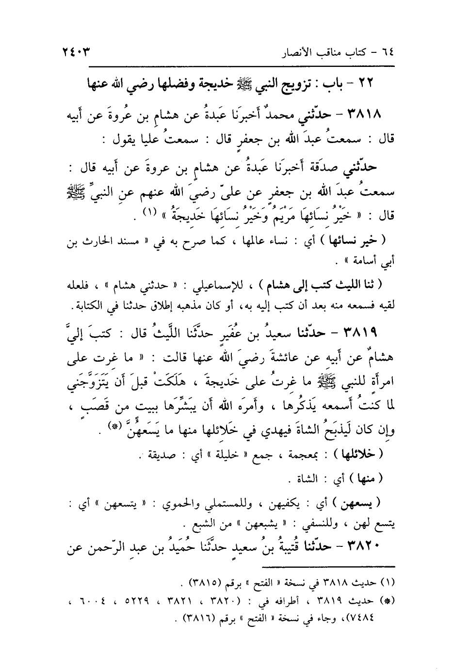 3819 - حَدَّثَنَا سَعِيدُ بْنُ عُفَيْرٍ، حَدَّثَنَا اللَّيْثُ، قَالَ: كَتَبَ إِلَيَّ هِشَامٌ، عَنْ أَبِيهِ، عَنْ عَائِشَةَ، رَضِيَ اللَّهُ عَنْهَا، قَالَتْ: «مَا غِرْتُ عَلَى امْرَأَةٍ لِلنَّبِيِّ صَلَّى اللهُ عَلَيْهِ وَسَلَّمَ، مَا غِرْتُ عَلَى خَدِيجَةَ، هَلَكَتْ قَبْلَ أَنْ يَتَزَوَّجَنِي، لِمَا كُنْتُ أَسْمَعُهُ يَذْكُرُهَا، وَأَمَرَهُ اللَّهُ أَنْ يُبَشِّرَهَا بِبَيْتٍ مِنْ قَصَبٍ، وَإِنْ كَانَ لَيَذْبَحُ الشَّاةَ فَيُهْدِي فِي خَلاَئِلِهَا مِنْهَا مَا يَسَعُهُنَّ».