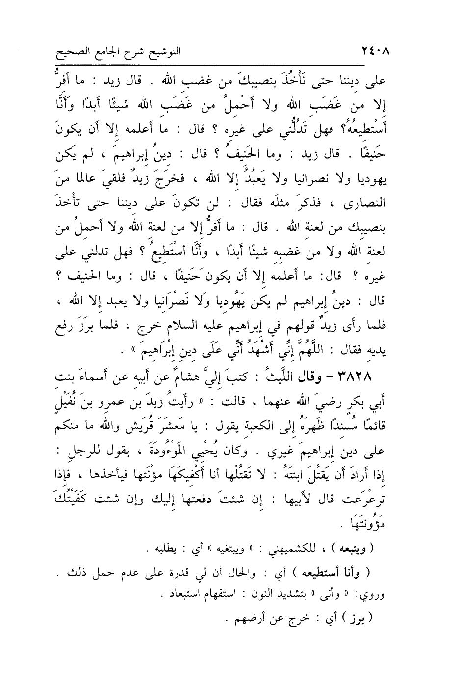 عَلَى دِينِنَا حَتَّى تَأْخُذَ بِنَصِيبِكَ مِنْ غَضَبِ اللَّهِ، قَالَ زَيْدٌ مَا أَفِرُّ إِلَّا مِنْ غَضَبِ اللَّهِ، وَلاَ أَحْمِلُ مِنْ غَضَبِ اللَّهِ شَيْئًا أَبَدًا، وَأَنَّى أَسْتَطِيعُهُ فَهَلْ تَدُلُّنِي عَلَى غَيْرِهِ، قَالَ: مَا أَعْلَمُهُ إِلَّا أَنْ يَكُونَ حَنِيفًا، قَالَ زَيْدٌ: وَمَا الحَنِيفُ؟ قَالَ: دِينُ إِبْرَاهِيمَ لَمْ يَكُنْ يَهُودِيًّا، وَلاَ نَصْرَانِيًّا، وَلاَ يَعْبُدُ إِلَّا اللَّهَ، فَخَرَجَ زَيْدٌ فَلَقِيَ عَالِمًا مِنَ النَّصَارَى فَذَكَرَ مِثْلَهُ، فَقَالَ: لَنْ تَكُونَ عَلَى دِينِنَا حَتَّى تَأْخُذَ بِنَصِيبِكَ مِنْ لَعْنَةِ اللَّهِ، قَالَ: مَا أَفِرُّ إِلَّا مِنْ لَعْنَةِ اللَّهِ، وَلاَ أَحْمِلُ مِنْ لَعْنَةِ اللَّهِ، وَلاَ مِنْ غَضَبِهِ شَيْئًا أَبَدًا، وَأَنَّى أَسْتَطِيعُ فَهَلْ تَدُلُّنِي عَلَى غَيْرِهِ، قَالَ: مَا أَعْلَمُهُ إِلَّا أَنْ يَكُونَ حَنِيفًا، قَالَ: وَمَا الحَنِيفُ؟ قَالَ: دِينُ إِبْرَاهِيمَ لَمْ يَكُنْ يَهُودِيًّا وَلاَ نَصْرَانِيًّا، وَلاَ يَعْبُدُ إِلَّا اللَّهَ، فَلَمَّا رَأَى زَيْدٌ قَوْلَهُمْ فِي إِبْرَاهِيمَ عَلَيْهِ السَّلاَمُ خَرَجَ، فَلَمَّا بَرَزَ رَفَعَ يَدَيْهِ فَقَالَ: اللَّهُمَّ إِنِّي أَشْهَدُ أَنِّي عَلَى دِينِ إِبْرَاهِيمَ".