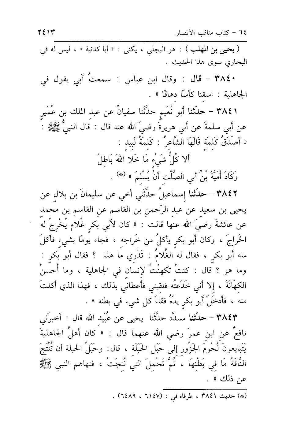 3841 - حَدَّثَنَا أَبُو نُعَيْمٍ، حَدَّثَنَا سُفْيَانُ، عَنْ عَبْدِ المَلِكِ، عَنْ أَبِي سَلَمَةَ، عَنْ أَبِي هُرَيْرَةَ رَضِيَ اللَّهُ عَنْهُ، قَالَ: قَالَ النَّبِيُّ صَلَّى اللهُ عَلَيْهِ وَسَلَّمَ: " أَصْدَقُ كَلِمَةٍ قَالَهَا الشَّاعِرُ، كَلِمَةُ لَبِيدٍ: