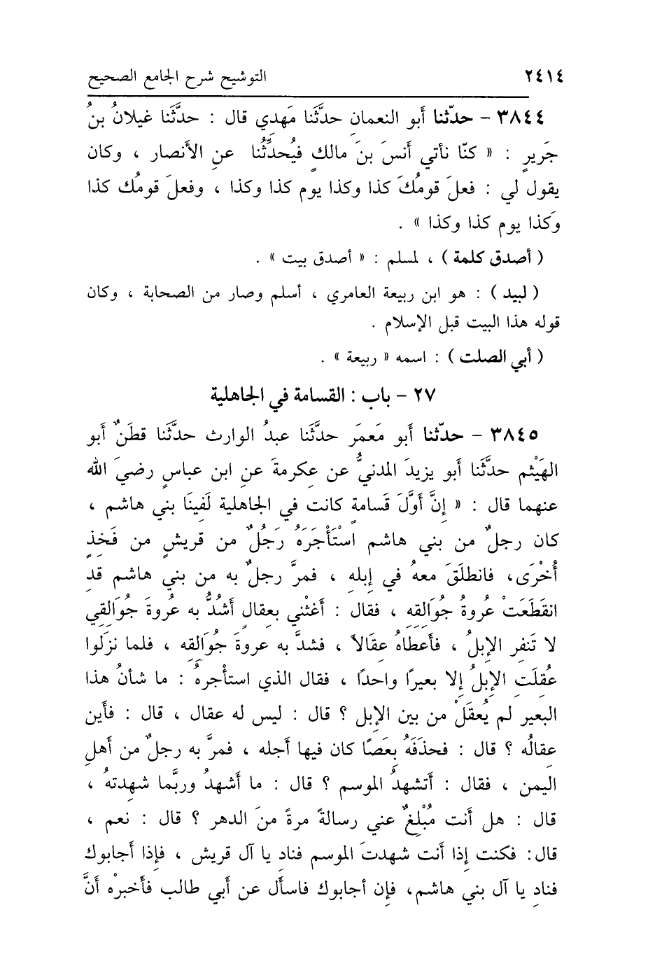 3845 - حَدَّثَنَا أَبُو مَعْمَرٍ، حَدَّثَنَا عَبْدُ الوَارِثِ، حَدَّثَنَا قَطَنٌ أَبُو الهَيْثَمِ، حَدَّثَنَا أَبُو يَزِيدَ المَدَنِيُّ، عَنْ عِكْرِمَةَ، عَنِ ابْنِ عَبَّاسٍ رَضِيَ اللَّهُ عَنْهُمَا، قَالَ: " إِنَّ أَوَّلَ قَسَامَةٍ كَانَتْ فِي الجَاهِلِيَّةِ، لَفِينَا بَنِي هَاشِمٍ، كَانَ رَجُلٌ مِنْ بَنِي هَاشِمٍ، اسْتَأْجَرَهُ رَجُلٌ مِنْ قُرَيْشٍ مِنْ فَخِذٍ أُخْرَى، فَانْطَلَقَ مَعَهُ فِي إِبِلِهِ، فَمَرَّ رَجُلٌ بِهِ مِنْ بَنِي هَاشِمٍ، قَدِ انْقَطَعَتْ عُرْوَةُ جُوَالِقِهِ، فَقَالَ: أَغِثْنِي بِعِقَالٍ أَشُدُّ بِهِ عُرْوَةَ جُوَالِقِي، لاَ تَنْفِرُ الإِبِلُ، فَأَعْطَاهُ عِقَالًا فَشَدَّ بِهِ عُرْوَةَ جُوَالِقِهِ، فَلَمَّا نَزَلُوا عُقِلَتِ الإِبِلُ إِلَّا بَعِيرًا وَاحِدًا، فَقَالَ الَّذِي اسْتَأْجَرَهُ: مَا شَأْنُ هَذَا البَعِيرِ لَمْ يُعْقَلْ مِنْ بَيْنِ الإِبِلِ؟ قَالَ: لَيْسَ لَهُ عِقَالٌ، قَالَ: فَأَيْنَ عِقَالُهُ؟ قَالَ: فَحَذَفَهُ بِعَصًا كَانَ فِيهَا أَجَلُهُ، فَمَرَّ بِهِ رَجُلٌ مِنْ أَهْلِ اليَمَنِ، فَقَالَ: أَتَشْهَدُ المَوْسِمَ؟ قَالَ: مَا أَشْهَدُ، وَرُبَّمَا شَهِدْتُهُ، قَالَ: هَلْ أَنْتَ مُبْلِغٌ عَنِّي رِسَالَةً مَرَّةً مِنَ الدَّهْرِ؟ قَالَ: نَعَمْ، قَالَ: فَكَتَبَ إِذَا أَنْتَ شَهِدْتَ المَوْسِمَ فَنَادِ: يَا آلَ قُرَيْشٍ، فَإِذَا أَجَابُوكَ فَنَادِ: يَا آلَ بَنِي هَاشِمٍ، فَإِنْ أَجَابُوكَ، فَسَلْ عَنْ أَبِي طَالِبٍ فَأَخْبِرْهُ: أَنَّ