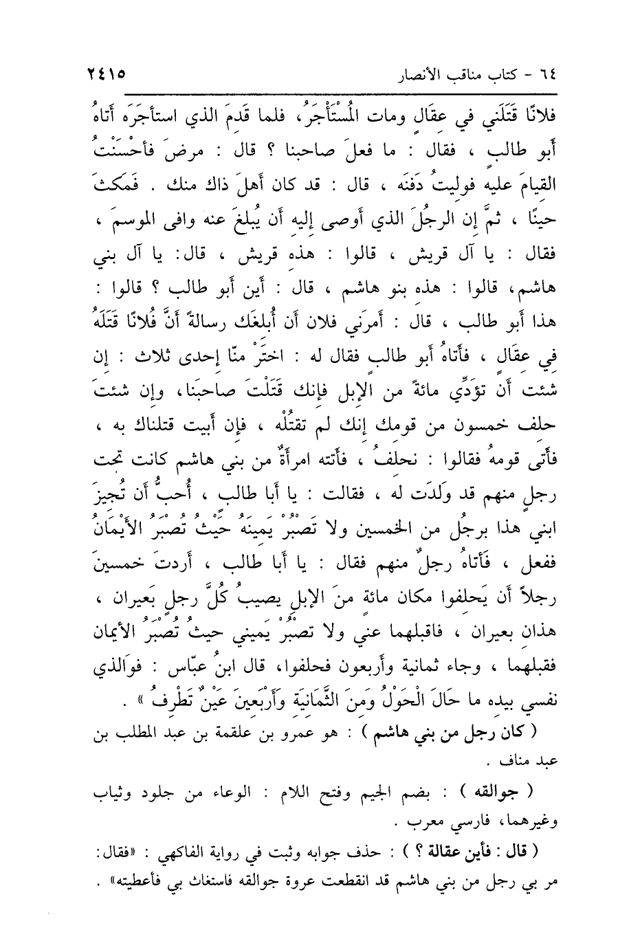 فُلاَنًا قَتَلَنِي فِي عِقَالٍ، وَمَاتَ المُسْتَأْجَرُ، فَلَمَّا قَدِمَ الَّذِي اسْتَأْجَرَهُ، أَتَاهُ أَبُو طَالِبٍ فَقَالَ: مَا فَعَلَ صَاحِبُنَا؟، قَالَ: مَرِضَ، فَأَحْسَنْتُ القِيَامَ عَلَيْهِ، فَوَلِيتُ دَفْنَهُ، قَالَ: قَدْ كَانَ أَهْلَ ذَاكَ مِنْكَ، فَمَكُثَ حِينًا، ثُمَّ إِنَّ الرَّجُلَ الَّذِي أَوْصَى إِلَيْهِ أَنْ يُبْلِغَ عَنْهُ وَافَى المَوْسِمَ، فَقَالَ: يَا آلَ قُرَيْشٍ، قَالُوا: هَذِهِ قُرَيْشٌ، قَالَ: يَا آلَ بَنِي هَاشِمٍ؟ قَالُوا: هَذِهِ بَنُو هَاشِمٍ، قَالَ: أَيْنَ أَبُو طَالِبٍ؟ قَالُوا: هَذَا أَبُو طَالِبٍ، قَالَ: أَمَرَنِي فُلاَنٌ أَنْ أُبْلِغَكَ رِسَالَةً، أَنَّ فُلاَنًا قَتَلَهُ فِي عِقَالٍ. فَأَتَاهُ أَبُو طَالِبٍ فَقَالَ لَهُ: اخْتَرْ مِنَّا إِحْدَى ثَلاَثٍ: إِنْ شِئْتَ أَنْ تُؤَدِّيَ مِائَةً مِنَ الإِبِلِ فَإِنَّكَ قَتَلْتَ صَاحِبَنَا، وَإِنْ شِئْتَ حَلَفَ خَمْسُونَ مِنْ قَوْمِكَ إِنَّكَ لَمْ تَقْتُلْهُ، فَإِنْ أَبَيْتَ قَتَلْنَاكَ بِهِ، فَأَتَى قَوْمَهُ فَقَالُوا: نَحْلِفُ، فَأَتَتْهُ امْرَأَةٌ مِنْ بَنِي هَاشِمٍ، كَانَتْ تَحْتَ رَجُلٍ مِنْهُمْ، قَدْ وَلَدَتْ لَهُ، فَقَالَتْ: يَا أَبَا طَالِبٍ، أُحِبُّ أَنْ تُجِيزَ ابْنِي هَذَا بِرَجُلٍ مِنَ الخَمْسِينَ، وَلاَ تُصْبِرْ يَمِينَهُ حَيْثُ تُصْبَرُ الأَيْمَانُ، فَفَعَلَ، فَأَتَاهُ رَجُلٌ مِنْهُمْ فَقَالَ: يَا أَبَا طَالِبٍ أَرَدْتَ خَمْسِينَ رَجُلًا أَنْ يَحْلِفُوا مَكَانَ مِائَةٍ مِنَ الإِبِلِ، يُصِيبُ كُلَّ رَجُلٍ بَعِيرَانِ، هَذَانِ بَعِيرَانِ فَاقْبَلْهُمَا عَنِّي وَلاَ تُصْبِرْ يَمِينِي حَيْثُ تُصْبَرُ الأَيْمَانُ، فَقَبِلَهُمَا، وَجَاءَ ثَمَانِيَةٌ وَأَرْبَعُونَ فَحَلَفُوا، قَالَ ابْنُ عَبَّاسٍ: فَوَالَّذِي نَفْسِي بِيَدِهِ، مَا حَالَ الحَوْلُ، وَمِنَ الثَّمَانِيَةِ وَأَرْبَعِينَ عَيْنٌ تَطْرِفُ".