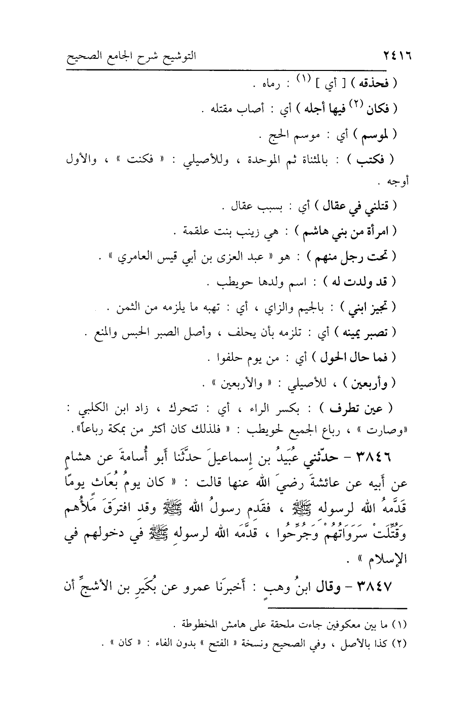 (عين تطرف): بكسر الراء، أي: تتحرك، زاد ابن الكلبي: "وصارت"، رباع الجميع لحويطب: "فلذلك كان أكثر من بمكة رباعًا".