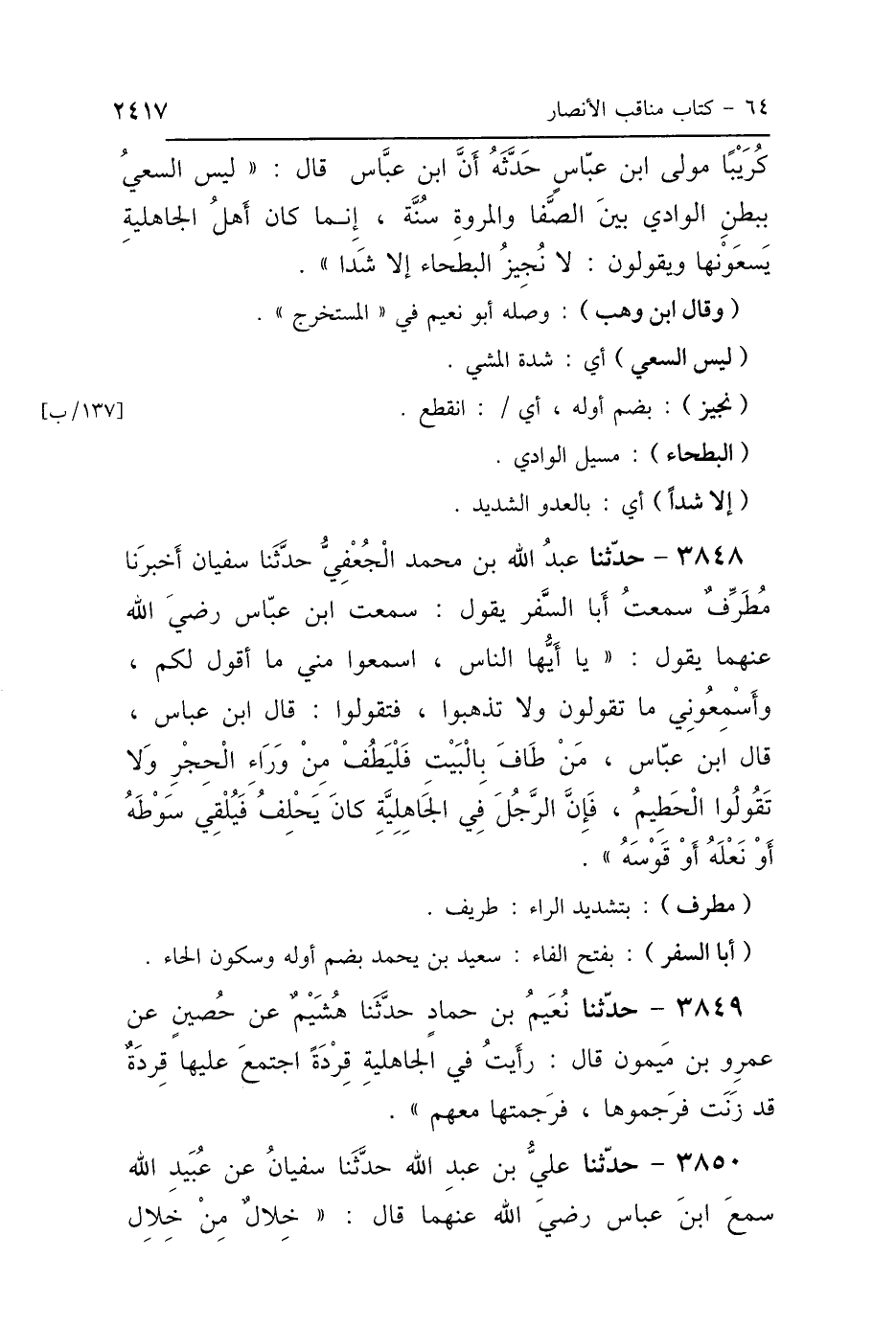 3848 - حَدَّثَنَا عَبْدُ اللَّهِ بْنُ مُحَمَّدٍ الجُعْفِيُّ، حَدَّثَنَا سُفْيَانُ، أَخْبَرَنَا مُطَرِّفٌ، سَمِعْتُ أَبَا السَّفَرِ، يَقُولُ: سَمِعْتُ ابْنَ عَبَّاسٍ رَضِيَ اللَّهُ عَنْهُمَا، يَقُولُ: «يَا أَيُّهَا النَّاسُ اسْمَعُوا مِنِّي مَا أَقُولُ لَكُمْ، وَأَسْمِعُونِي مَا تَقُولُونَ، وَلاَ تَذْهَبُوا فَتَقُولُوا قَالَ ابْنُ عَبَّاسٍ قَالَ ابْنُ عَبَّاسٍ مَنْ طَافَ بِالْبَيْتِ فَلْيَطُفْ مِنْ وَرَاءِ الحِجْرِ، وَلاَ تَقُولُوا الحَطِيمُ فَإِنَّ الرَّجُلَ فِي الجَاهِلِيَّةِ كَانَ يَحْلِفُ فَيُلْقِي سَوْطَهُ أَوْ نَعْلَهُ أَوْ قَوْسَهُ».