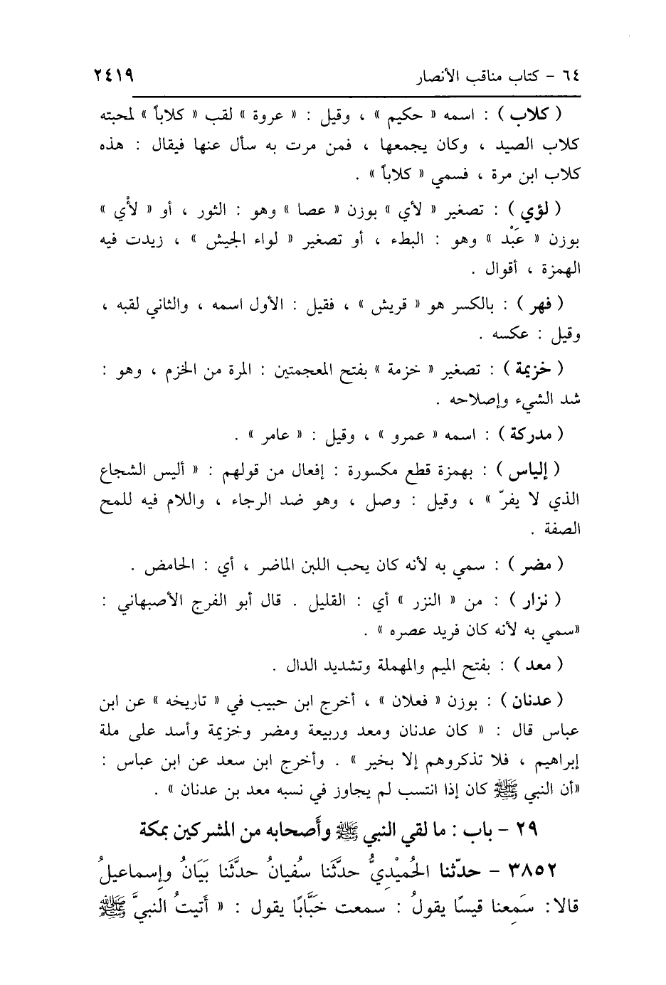 (عدنان): بوزن "فعلان"، أخرج ابن حبيب في "تاريخه" عن ابن عباس قال: "كان عدنان ومعد وربيعة ومضر وخزيمة وأسد على ملة إبراهيم، فلا تذكروهم إلا بخير". وأخرج ابن سعد عن ابن عباس: "أن النبي - صلى الله عليه وسلم - كان إذا انتسب لم يجاوز في نسبه معد بن عدنان".