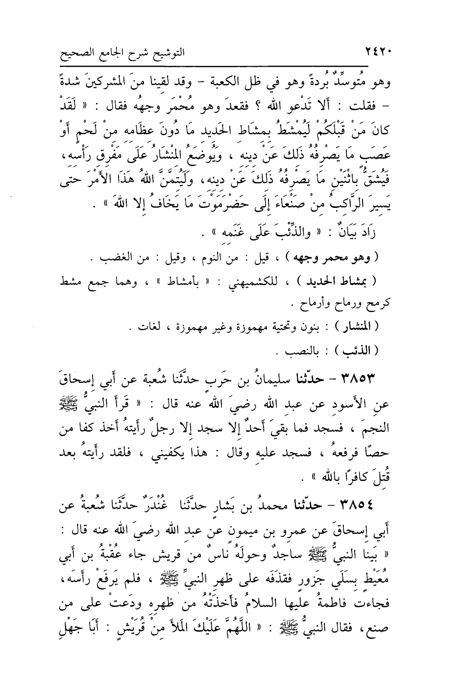 3854 - حَدَّثَنِي مُحَمَّدُ بْنُ بَشَّارٍ، حَدَّثَنَا غُنْدَرٌ، حَدَّثَنَا شُعْبَةُ، عَنْ أَبِي إِسْحَاقَ، عَنْ عَمْرِو بْنِ مَيْمُونٍ، عَنْ عَبْدِ اللَّهِ رَضِيَ اللَّهُ عَنْهُ، قَالَ: بَيْنَا النَّبِيُّ صَلَّى اللهُ عَلَيْهِ وَسَلَّمَ سَاجِدٌ، وَحَوْلَهُ نَاسٌ مِنْ قُرَيْشٍ، جَاءَ عُقْبَةُ بْنُ أَبِي مُعَيْطٍ بِسَلَى جَزُورٍ، فَقَذَفَهُ عَلَى ظَهْرِ النَّبِيِّ صَلَّى اللهُ عَلَيْهِ وَسَلَّمَ، فَلَمْ يَرْفَعْ رَأْسَهُ، فَجَاءَتْ فَاطِمَةُ عَلَيْهَا السَّلاَمُ فَأَخَذَتْهُ مِنْ ظَهْرِهِ، وَدَعَتْ عَلَى مَنْ صَنَعَ، فَقَالَ النَّبِيُّ صَلَّى اللهُ عَلَيْهِ وَسَلَّمَ: "اللَّهُمَّ عَلَيْكَ المَلَأَ مِنْ قُرَيْشٍ: أَبَا جَهْلِ