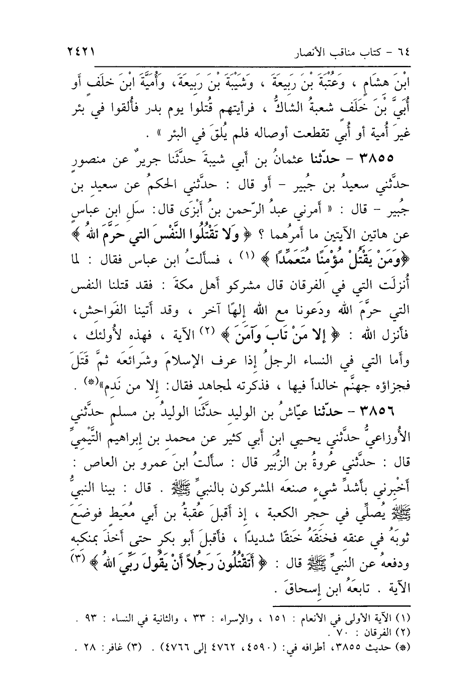 3855 - حَدَّثَنَا عُثْمَانُ بْنُ أَبِي شَيْبَةَ، حَدَّثَنَا جَرِيرٌ، عَنْ مَنْصُورٍ، حَدَّثَنِي سَعِيدُ بْنُ جُبَيْرٍ، أَوْ قَالَ: حَدَّثَنِي الحَكَمُ، عَنْ سَعِيدِ بْنِ جُبَيْرٍ، قَالَ: أَمَرَنِي عَبْدُ الرَّحْمَنِ بْنُ أَبْزَى، قَالَ: سَلْ ابْنَ عَبَّاسٍ، عَنْ هَاتَيْنِ الآيَتَيْنِ مَا أَمْرُهُمَا {وَلاَ تَقْتُلُوا النَّفْسَ الَّتِي حَرَّمَ اللَّهُ إِلَّا بِالحَقِّ} [الأنعام: 151]، {وَمَنْ يَقْتُلْ مُؤْمِنًا مُتَعَمِّدًا} [النساء: 93] فَسَأَلْتُ ابْنَ عَبَّاسٍ فَقَالَ: " لَمَّا أُنْزِلَتِ الَّتِي فِي الفُرْقَانِ، قَالَ: مُشْرِكُو أَهْلِ مَكَّةَ: فَقَدْ قَتَلْنَا النَّفْسَ الَّتِي حَرَّمَ اللَّهُ، وَدَعَوْنَا مَعَ اللَّهِ إِلَهًا آخَرَ، وَقَدْ أَتَيْنَا الفَوَاحِشَ، فَأَنْزَلَ اللَّهُ: {إِلَّا مَنْ تَابَ وَآمَنَ} [مريم: 60]. الآيَةَ، فَهَذِهِ لِأُولَئِكَ، وَأَمَّا الَّتِي فِي النِّسَاءِ: الرَّجُلُ إِذَا عَرَفَ الإِسْلاَمَ وَشَرَائِعَهُ، ثُمَّ قَتَلَ فَجَزَاؤُهُ جَهَنَّمُ "، فَذَكَرْتُهُ لِمُجَاهِدٍ فَقَالَ: «إِلَّا مَنْ نَدِمَ.