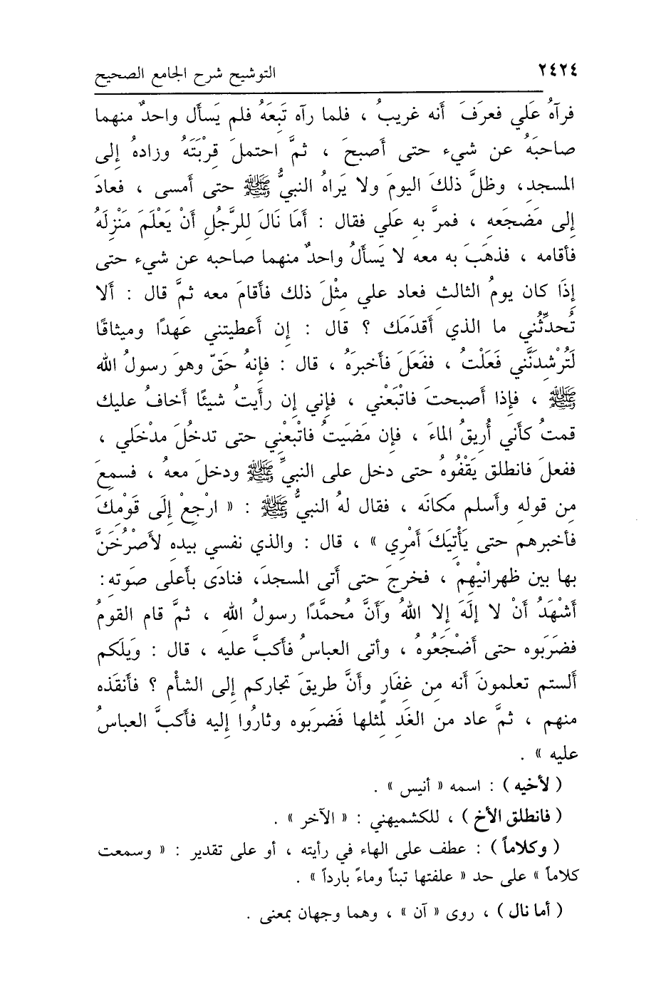 فَاضْطَجَعَ فَرَآهُ عَلِيٌّ فَعَرَفَ أَنَّهُ غَرِيبٌ، فَلَمَّا رَآهُ تَبِعَهُ فَلَمْ يَسْأَلْ وَاحِدٌ مِنْهُمَا صَاحِبَهُ عَنْ شَيْءٍ حَتَّى أَصْبَحَ، ثُمَّ احْتَمَلَ قِرْبَتَهُ وَزَادَهُ إِلَى المَسْجِدِ، وَظَلَّ ذَلِكَ اليَوْمَ وَلاَ يَرَاهُ النَّبِيُّ صَلَّى اللهُ عَلَيْهِ وَسَلَّمَ حَتَّى أَمْسَى، فَعَادَ إِلَى مَضْجَعِهِ، فَمَرَّ بِهِ عَلِيٌّ فَقَالَ: أَمَا نَالَ لِلرَّجُلِ أَنْ يَعْلَمَ مَنْزِلَهُ؟ فَأَقَامَهُ فَذَهَبَ بِهِ مَعَهُ، لاَ يَسْأَلُ وَاحِدٌ مِنْهُمَا صَاحِبَهُ عَنْ شَيْءٍ، حَتَّى إِذَا كَانَ يَوْمُ الثَّالِثِ، فَعَادَ عَلِيٌّ عَلَى مِثْلِ ذَلِكَ، فَأَقَامَ مَعَهُ ثُمَّ قَالَ: أَلاَ تُحَدِّثُنِي مَا الَّذِي أَقْدَمَكَ؟ قَالَ: إِنْ أَعْطَيْتَنِي عَهْدًا وَمِيثَاقًا لَتُرْشِدَنِّي فَعَلْتُ، فَفَعَلَ فَأَخْبَرَهُ، قَالَ: فَإِنَّهُ حَقٌّ، وَهُوَ رَسُولُ اللَّهِ صَلَّى اللهُ عَلَيْهِ وَسَلَّمَ، فَإِذَا أَصْبَحْتَ فَاتْبَعْنِي، فَإِنِّي إِنْ رَأَيْتُ شَيْئًا أَخَافُ عَلَيْكَ قُمْتُ كَأَنِّي أُرِيقُ المَاءَ، فَإِنْ مَضَيْتُ فَاتْبَعْنِي حَتَّى تَدْخُلَ مَدْخَلِي فَفَعَلَ، فَانْطَلَقَ يَقْفُوهُ حَتَّى دَخَلَ عَلَى النَّبِيِّ صَلَّى اللهُ عَلَيْهِ وَسَلَّمَ، وَدَخَلَ مَعَهُ، فَسَمِعَ مِنْ قَوْلِهِ وَأَسْلَمَ مَكَانَهُ، فَقَالَ لَهُ النَّبِيُّ صَلَّى اللهُ عَلَيْهِ وَسَلَّمَ: «ارْجِعْ إِلَى قَوْمِكَ فَأَخْبِرْهُمْ حَتَّى يَأْتِيَكَ أَمْرِي» قَالَ: وَالَّذِي نَفْسِي بِيَدِهِ، لَأَصْرُخَنَّ بِهَا بَيْنَ ظَهْرَانَيْهِمْ، فَخَرَجَ حَتَّى أَتَى المَسْجِدَ، فَنَادَى بِأَعْلَى صَوْتِهِ: أَشْهَدُ أَنْ لاَ إِلَهَ إِلَّا اللَّهُ، وَأَنَّ مُحَمَّدًا رَسُولُ اللَّهِ، ثُمَّ قَامَ القَوْمُ فَضَرَبُوهُ حَتَّى أَضْجَعُوهُ، وَأَتَى العَبَّاسُ فَأَكَبَّ عَلَيْهِ، قَالَ: وَيْلَكُمْ أَلَسْتُمْ تَعْلَمُونَ أَنَّهُ مِنْ غِفَارٍ، وَأَنَّ طَرِيقَ تِجَارِكُمْ إِلَى الشَّأْمِ، فَأَنْقَذَهُ مِنْهُمْ، ثُمَّ عَادَ مِنَ الغَدِ لِمِثْلِهَا، فَضَرَبُوهُ وَثَارُوا إِلَيْهِ، فَأَكَبَّ العَبَّاسُ عَلَيْهِ.