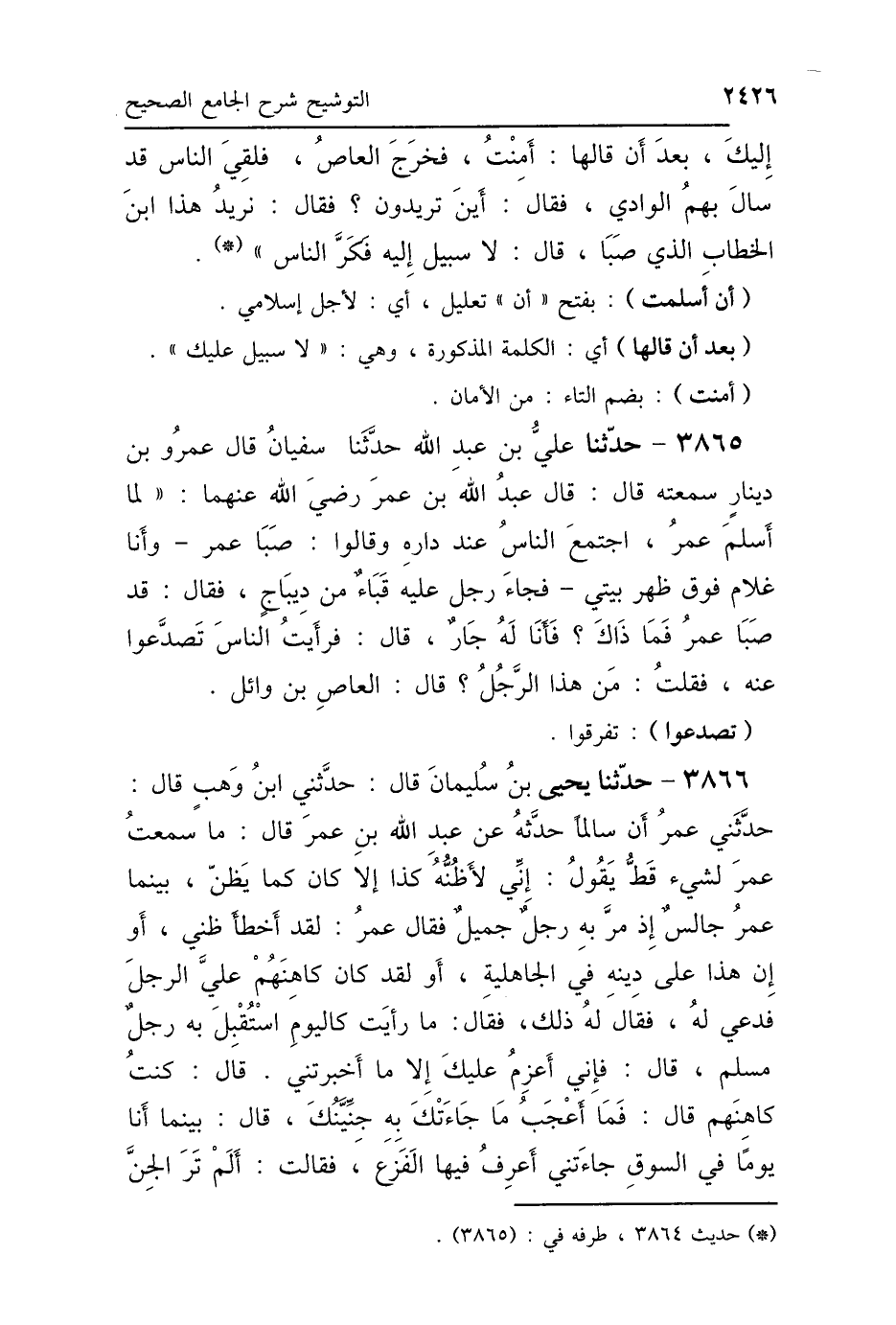 إِلَيْكَ، بَعْدَ أَنْ قَالَهَا أَمِنْتُ، فَخَرَجَ العَاصِ فَلَقِيَ النَّاسَ قَدْ سَالَ بِهِمُ الوَادِي، فَقَالَ: أَيْنَ تُرِيدُونَ؟ فَقَالُوا: نُرِيدُ هَذَا ابْنَ الخَطَّابِ الَّذِي صَبَا، قَالَ: لاَ سَبِيلَ إِلَيْهِ فَكَرَّ النَّاسُ".
