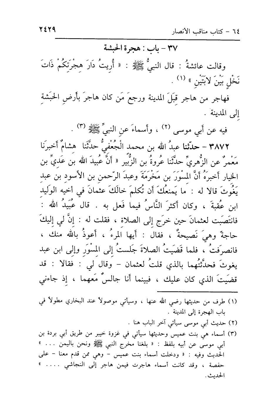 وَقَالَتْ عَائِشَةُ: قَالَ النَّبِيُّ صَلَّى اللهُ عَلَيْهِ وَسَلَّمَ: «أُرِيتُ دَارَ هِجْرَتِكُمْ، ذَاتَ نَخْلٍ بَيْنَ لاَبَتَيْنِ» فَهَاجَرَ مَنْ هَاجَرَ قِبَلَ المَدِينَةِ، وَرَجَعَ عَامَّةُ مَنْ كَانَ هَاجَرَ بِأَرْضِ الحَبَشَةِ إِلَى المَدِينَةِ فِيهِ عَنْ أَبِي مُوسَى، وَأَسْمَاءَ، عَنِ النَّبِيِّ صَلَّى اللهُ عَلَيْهِ وَسَلَّمَ.