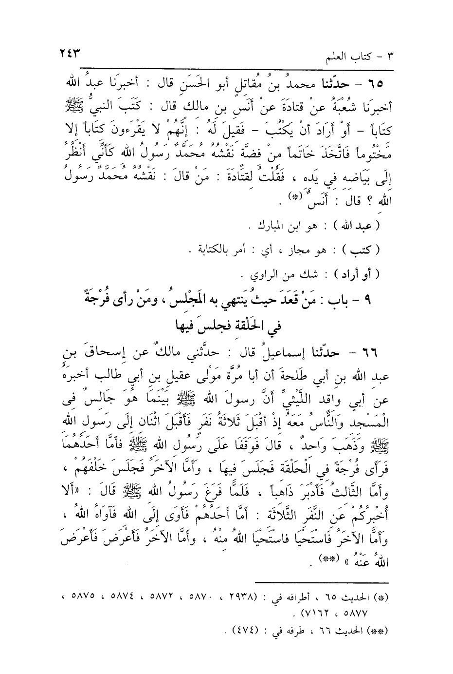 65 - حَدَّثَنَا مُحَمَّدُ بْنُ مُقَاتِلٍ أَبُو الحَسَنِ المَرْوَزِيُّ، أَخْبَرَنَا عَبْدُ اللَّهِ، قَالَ: أَخْبَرَنَا شُعْبَةُ، عَنْ قَتَادَةَ، عَنْ أَنَسِ بْنِ مَالِكٍ، قَالَ: كَتَبَ النَّبِيُّ صَلَّى اللهُ عَلَيْهِ وَسَلَّمَ كِتَابًا - أَوْ أَرَادَ أَنْ يَكْتُبَ - فَقِيلَ لَهُ: إِنَّهُمْ لاَ يَقْرَءُونَ كِتَابًا إِلَّا مَخْتُومًا، فَاتَّخَذَ خَاتَمًا مِنْ فِضَّةٍ، نَقْشُهُ: مُحَمَّدٌ رَسُولُ اللَّهِ، كَأَنِّي أَنْظُرُ إِلَى بَيَاضِهِ فِي يَدِهِ، فَقُلْتُ لِقَتَادَةَ مَنْ قَالَ: نَقْشُهُ مُحَمَّدٌ رَسُولُ اللَّهِ؟ قَالَ أَنَسٌ.
