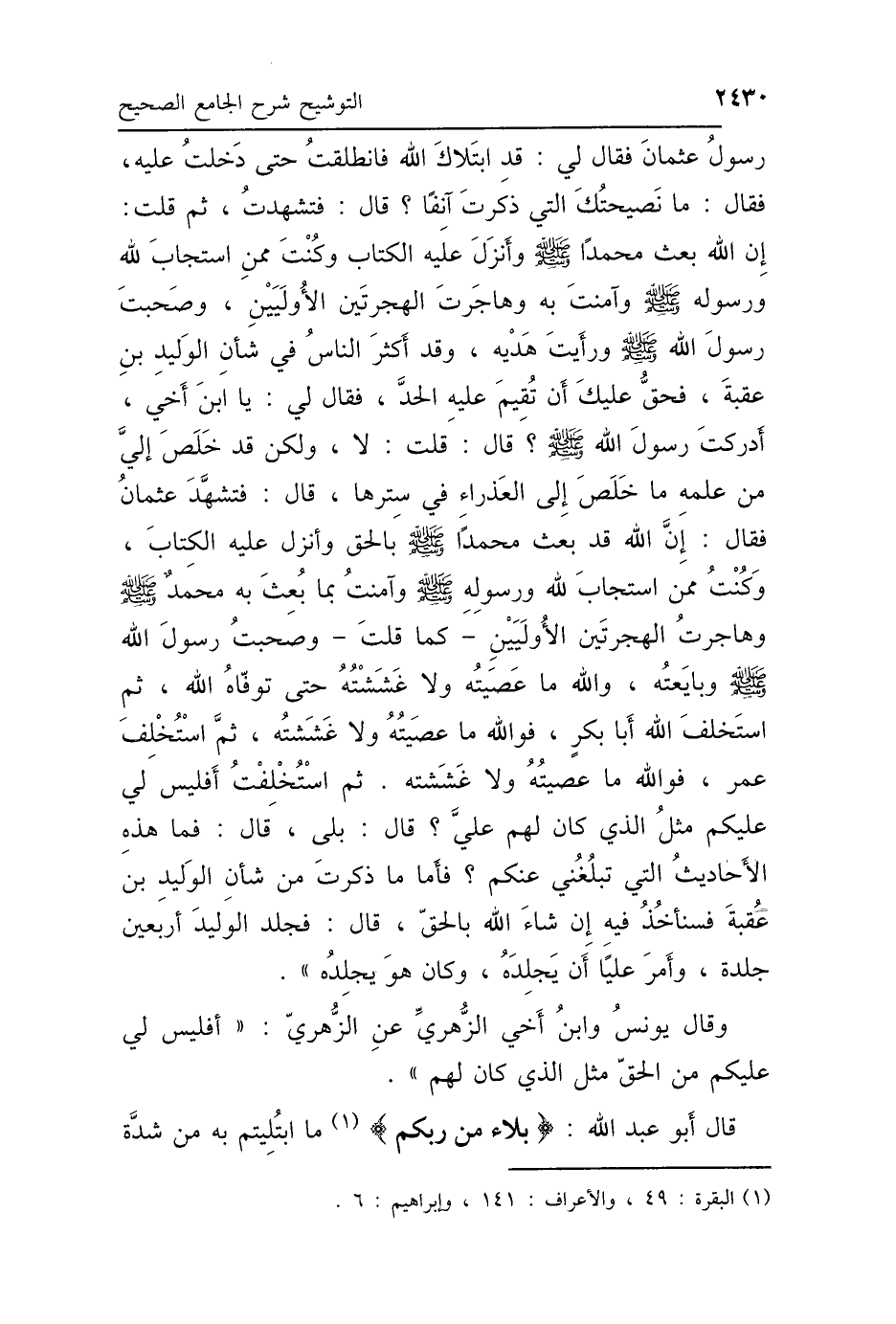 رَسُولُ عُثْمَانَ، فَقَالاَ لِي: قَدِ ابْتَلاَكَ اللَّهُ، فَانْطَلَقْتُ حَتَّى دَخَلْتُ عَلَيْهِ، فَقَالَ: مَا نَصِيحَتُكَ الَّتِي ذَكَرْتَ آنِفًا؟ قَالَ: فَتَشَهَّدْتُ، ثُمَّ قُلْتُ: "إِنَّ اللَّهَ بَعَثَ مُحَمَّدًا صَلَّى اللهُ عَلَيْهِ وَسَلَّمَ وَأَنْزَلَ عَلَيْهِ الكِتَابَ، وَكُنْتَ مِمَّنِ اسْتَجَابَ لِلَّهِ وَرَسُولِهِ صَلَّى اللهُ عَلَيْهِ وَسَلَّمَ وَآمَنْتَ بِهِ، وَهَاجَرْتَ الهِجْرَتَيْنِ الأُولَيَيْنِ، وَصَحِبْتَ رَسُولَ اللَّهِ صَلَّى اللهُ عَلَيْهِ وَسَلَّمَ وَرَأَيْتَ هَدْيَهُ، وَقَدْ أَكْثَرَ النَّاسُ فِي شَأْنِ الوَلِيدِ بْنِ عُقْبَةَ، فَحَقٌّ عَلَيْكَ أَنْ تُقِيمَ عَلَيْهِ الحَدَّ، فَقَالَ لِي: يَا ابْنَ أَخِي، آدْرَكْتَ رَسُولَ اللَّهِ صَلَّى اللهُ عَلَيْهِ وَسَلَّمَ؟ قَالَ: قُلْتُ: لاَ، وَلَكِنْ قَدْ خَلَصَ إِلَيَّ مِنْ عِلْمِهِ مَا خَلَصَ إِلَى العَذْرَاءِ فِي سِتْرِهَا، قَالَ: فَتَشَهَّدَ عُثْمَانُ، فَقَالَ: إِنَّ اللَّهَ قَدْ بَعَثَ مُحَمَّدًا صَلَّى اللهُ عَلَيْهِ وَسَلَّمَ بِالحَقِّ، وَأَنْزَلَ عَلَيْهِ الكِتَابَ، وَكُنْتُ مِمَّنِ اسْتَجَابَ لِلَّهِ وَرَسُولِهِ صَلَّى اللهُ عَلَيْهِ وَسَلَّمَ، وَآمَنْتُ بِمَا بُعِثَ بِهِ مُحَمَّدٌ صَلَّى اللهُ عَلَيْهِ وَسَلَّمَ، وَهَاجَرْتُ الهِجْرَتَيْنِ الأُولَيَيْنِ، كَمَا قُلْتَ: وَصَحِبْتُ رَسُولَ اللَّهِ وَبَايَعْتُهُ، وَاللَّهِ مَا عَصَيْتُهُ وَلاَ غَشَشْتُهُ حَتَّى تَوَفَّاهُ اللَّهُ، ثُمَّ اسْتَخْلَفَ اللَّهُ أَبَا بَكْرٍ، فَوَاللَّهِ مَا عَصَيْتُهُ وَلاَ غَشَشْتُهُ، ثُمَّ اسْتُخْلِفَ عُمَرُ، فَوَاللَّهِ مَا عَصَيْتُهُ وَلاَ غَشَشْتُهُ، ثُمَّ اسْتُخْلِفْتُ، أَفَلَيْسَ لِي عَلَيْكُمْ مِثْلُ الَّذِي كَانَ لَهُمْ عَلَيَّ؟ قَالَ: بَلَى، قَالَ: فَمَا هَذِهِ الأَحَادِيثُ الَّتِي تَبْلُغُنِي عَنْكُمْ؟ فَأَمَّا مَا ذَكَرْتَ مِنْ شَأْنِ الوَلِيدِ بْنِ عُقْبَةَ، فَسَنَأْخُذُ فِيهِ إِنْ شَاءَ اللَّهُ بِالحَقِّ، قَالَ: فَجَلَدَ الوَلِيدَ أَرْبَعِينَ جَلْدَةً، وَأَمَرَ عَلِيًّا أَنْ يَجْلِدَهُ، وَكَانَ هُوَ يَجْلِدُهُ " وَقَالَ يُونُسُ، وَابْنُ أَخِي الزُّهْرِيِّ، عَنِ الزُّهْرِيِّ: «أَفَلَيْسَ لِي عَلَيْكُمْ مِنَ الحَقِّ مِثْلُ الَّذِي كَانَ لَهُمْ» قَالَ: أَبُو عَبْدِ اللَّهِ: {بَلاَءٌ مِنْ رَبِّكُمْ} [البقرة: 49] مَا ابْتُلِيتُمْ بِهِ مِنْ شِدَّةٍ،