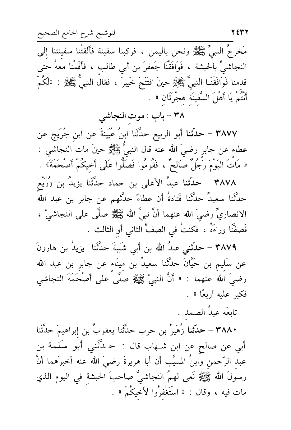 3879 - حَدَّثَنِي عَبْدُ اللَّهِ بْنُ أَبِي شَيْبَةَ، حَدَّثَنَا يَزِيدُ بْنُ هَارُونَ، عَنْ سَلِيمِ بْنِ حَيَّانَ، حَدَّثَنَا سَعِيدُ بْنُ مِينَاءَ، عَنْ جَابِرِ بْنِ عَبْدِ اللَّهِ رَضِيَ اللَّهُ عَنْهُمَا، أَنَّ النَّبِيَّ صَلَّى اللهُ عَلَيْهِ وَسَلَّمَ: «صَلَّى عَلَى أَصْحَمَةَ النَّجَاشِيِّ، فَكَبَّرَ عَلَيْهِ أَرْبَعًا» تَابَعَهُ عَبْدُ الصَّمَدِ.
