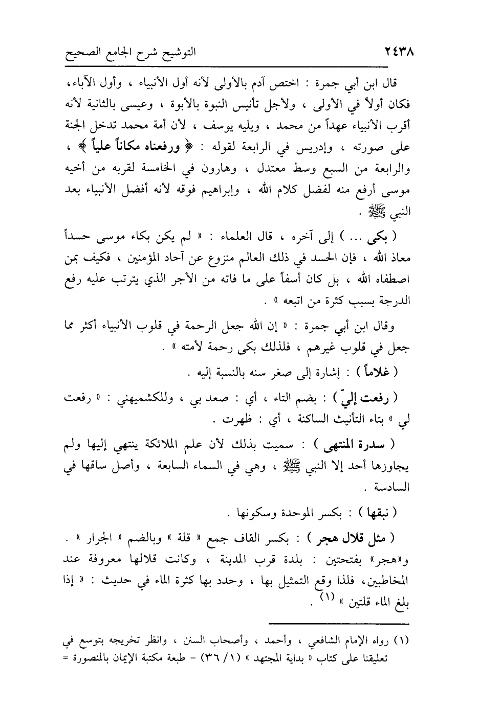 قال ابن أبي جمرة: اختص آدم بالأولى لأنه أول الأنبياء، وأول الآباء، فكان أولًا في الأولى، ولأجل تأنيس النبوة بالأبوة، وعيسى بالثانية لأنه أقرب الأنبياء عهدًا من محمد، ويليه يوسف، لأن أمة محمد تدخل الجنة على صورته، وإدريس في الرابعة لقوله: {وَرَفَعْنَاهُ مَكَانًا عَلِيًّا}، والرابعة من السبع وسط معتدل، وهارون في الخامسة لقربه من أخيه موسى أرفع منه لفضل كلام الله، وإبراهيم فوقه لأنه أفضل الأنبياء بعد النبي - صلى الله عليه وسلم -.
