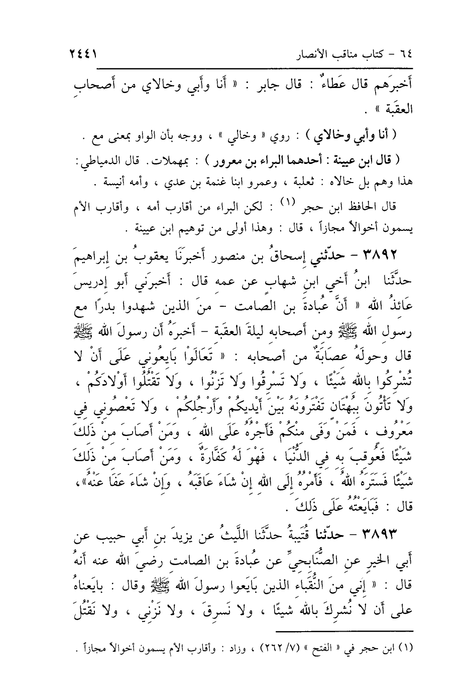 3892 - حَدَّثَنِي إِسْحَاقُ بْنُ مَنْصُورٍ، أَخْبَرَنَا يَعْقُوبُ بْنُ إِبْرَاهِيمَ، حَدَّثَنَا ابْنُ أَخِي ابْنِ شِهَابٍ، عَنْ عَمِّهِ، قَالَ: أَخْبَرَنِي أَبُو إِدْرِيسَ عَائِذُ اللَّهِ، أَنَّ عُبَادَةَ بْنَ الصَّامِتِ، مِنَ الَّذِينَ شَهِدُوا بَدْرًا مَعَ رَسُولِ اللَّهِ صَلَّى اللهُ عَلَيْهِ وَسَلَّمَ، وَمِنْ أَصْحَابِهِ لَيْلَةَ العَقَبَةِ أَخْبَرَهُ: أَنَّ رَسُولَ اللَّهِ صَلَّى اللهُ عَلَيْهِ وَسَلَّمَ، قَالَ: وَحَوْلَهُ عِصَابَةٌ مِنْ أَصْحَابِهِ: «تَعَالَوْا بَايِعُونِي عَلَى أَنْ لاَ تُشْرِكُوا بِاللَّهِ شَيْئًا، وَلاَ تَسْرِقُوا، وَلاَ تَزْنُوا، وَلاَ تَقْتُلُوا أَوْلاَدَكُمْ، وَلاَ تَأْتُوا بِبُهْتَانٍ تَفْتَرُونَهُ بَيْنَ أَيْدِيكُمْ وَأَرْجُلِكُمْ، وَلاَ تَعْصُونِي فِي مَعْرُوفٍ، فَمَنْ وَفَى مِنْكُمْ فَأَجْرُهُ عَلَى اللَّهِ، وَمَنْ أَصَابَ مِنْ ذَلِكَ شَيْئًا فَعُوقِبَ بِهِ فِي الدُّنْيَا فَهُوَ لَهُ كَفَّارَةٌ، وَمَنْ أَصَابَ مِنْ ذَلِكَ شَيْئًا فَسَتَرَهُ اللَّهُ فَأَمْرُهُ إِلَى اللَّهِ، إِنْ شَاءَ عَاقَبَهُ، وَإِنْ شَاءَ عَفَا عَنْهُ» قَالَ: فَبَايَعْتُهُ عَلَى ذَلِكَ.