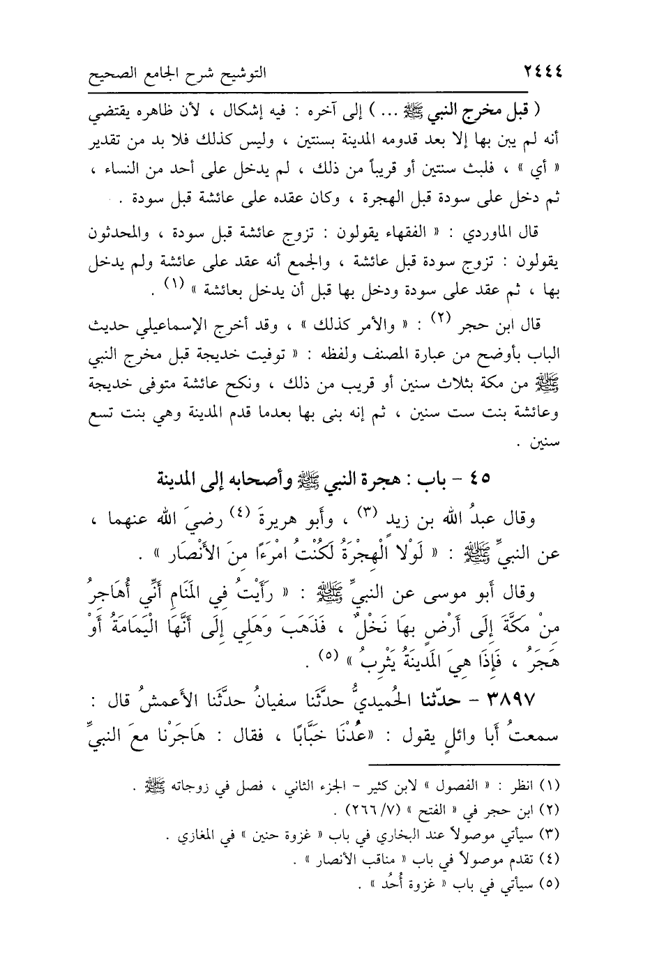 قال ابن حجر: "والأمر كذلك"، وقد أخرج الإسماعيلي حديث الباب بأوضح من عبارة المصنف ولفظه: "توفيت خديجة قبل مخرج النبي - صلى الله عليه وسلم - من مكة بثلاث سنين أو قريب من ذلك، ونكح عائشة متوفى خديجة وعائشة بنت ست سنين، ثم إنه بنى بها بعدما قدم المدينة وهي بنت تسع سنين.
